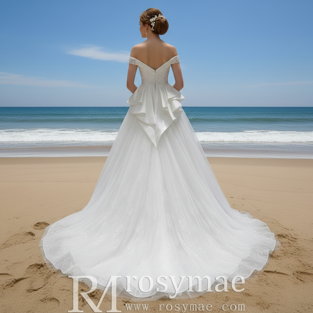 This classic off the shoulder ruffle skirt a-line wedding dress with v back showcases exceptional craftsmanship and sophisticated design, perfect for brides seeking a timeless yet distinctive look. The satin bodice is adorned with finely beaded rhinestones, providing a refined sparkle that catches the light subtly, enhancing the gown’s elegant charm. Beneath, an intricate lace lining adds a layer of delicate texture and visual interest, contrasting beautifully with the smooth satin finish with exquisite ruffles. The skirt features soft, layered tulle, imparting fluid movement and graceful volume as you walk, culminated by a sweeping chapel-length train that lends a majestic presence. The off-the-shoulder neckline elegantly frames the shoulders and collarbone, creating a romantic silhouette, while the deep V-back adds a sophisticated and flattering contour to the gown. Designed to blend classic bridal elements with contemporary refinement, this dress promises a stunning and memorable appearance for your special day, offering both comfort and style with every step.