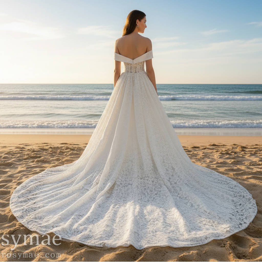 This gorgeous off-the-shoulder ball gown is expertly designed for brides who seek the perfect harmony of timeless elegance and contemporary sophistication. The sheer bodice, meticulously embellished with delicate pearls, catches the light to create a subtle yet stunning shimmer that beautifully complements the intricate floral lace overlay. Its graceful low back enhances the dress’s refined attractive, offering a modern twist while maintaining classic charm. A narrow sash delicately cinches the waist, accentuating the bride’s natural silhouette for a flattering and feminine fit. The cathedral-length train cascades dramatically, adding a regal aura and impressive movement ideal for ceremonial entrances and photographs. Crafted from high-quality materials, this gown delivers both visual impact and comfort, making it a standout choice for elegant brides who desire a memorable and breathtaking look on their wedding day. The design balances romantic details with sophisticated tailoring, ensuring the bride feels both stunning and confident. Perfect for formal venues and sophisticated celebrations, this dress embodies grace, luxury, and enduring style that will be remembered for a lifetime.