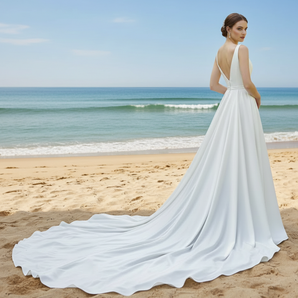 This satin A-line wedding dress features a deep V-neck, open back, and chapel train. The wide straps provide comfortable support while highlighting your shoulders and arms. The plunging neckline adds a touch of elegance and the open back adds a touch of sensuality. Perfect for the stylish bride.