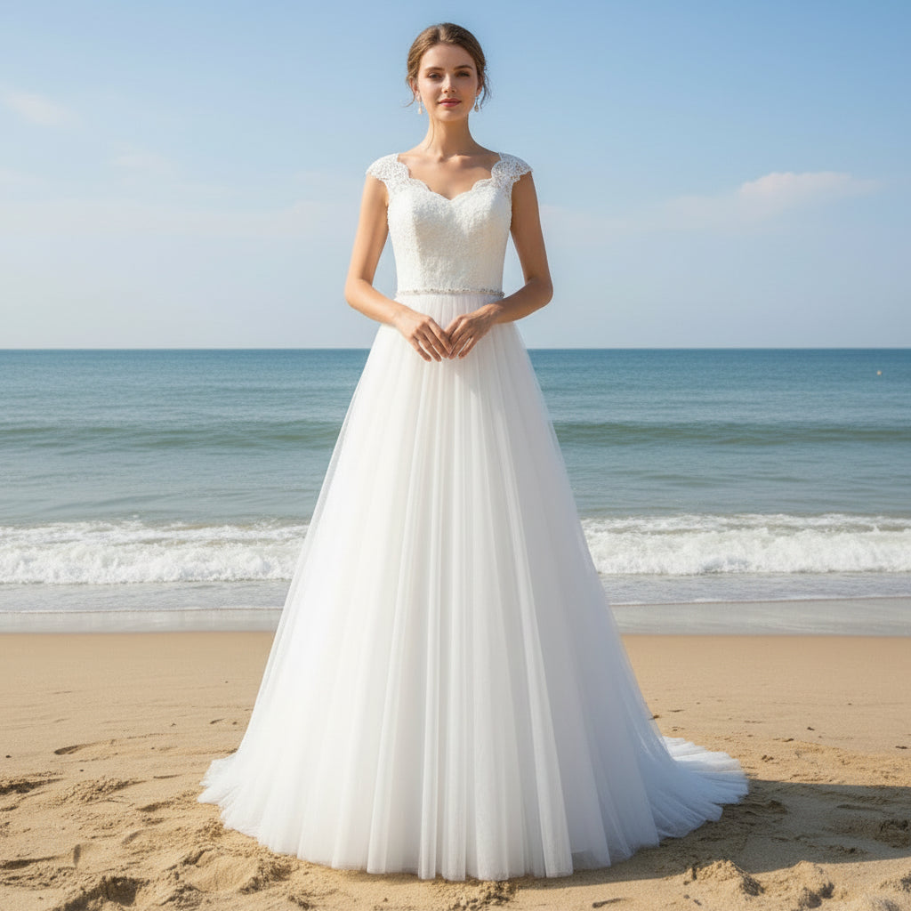 This vintage-inspired A-line wedding dress masterfully combines timeless elegance with all-day comfort, crafted to ensure you feel radiant on your most memorable day. The delicate lace bodice is designed with cap sleeves and a romantic sweetheart neckline, beautifully showcasing your shoulders and décolletage with a touch of vintage charm. A sparkling beaded crystal belt wraps around the waist, highlighting your natural curves while adding an exquisite shimmer that catches the light with every movement. The full, floor-length tulle skirt gently flares from the waist, offering a universally flattering silhouette that glides gracefully as you walk, symbolizing both freedom and style. Enhanced by its classic shape, this dress complements a wide range of settings, from elegant church ceremonies to whimsical garden celebrations. Its light and airy construction ensures comfort throughout your special moments, whether exchanging vows, sharing your first dance, or greeting loved ones. Embrace a look that combines romance and sophistication effortlessly, and create lasting memories wrapped in this enchanting gown designed to make you feel unforgettable from beginning to end.