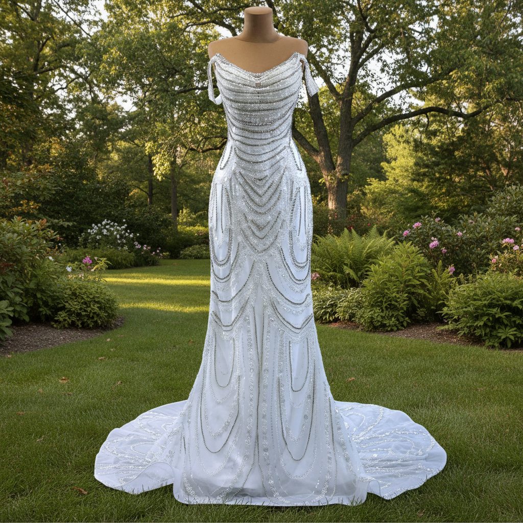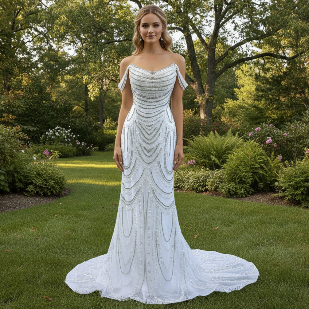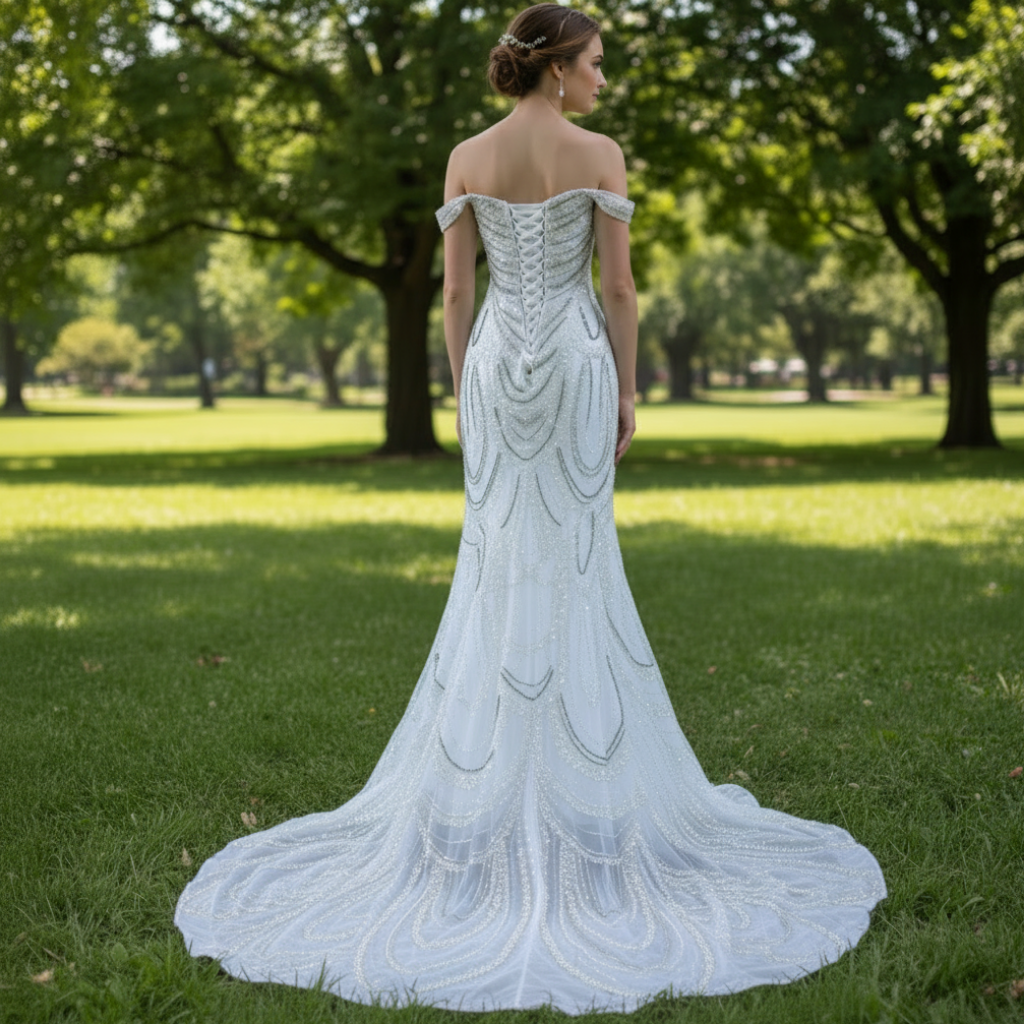 Immerse yourself in timeless beauty with this breathtaking white mermaid off the shoulder wedding dress, masterfully designed to highlight your elegance on the most important day of your life. The exquisite pearls and intricate beadwork are meticulously arranged to catch the light with every movement, creating a dazzling shimmer that enhances your radiant glow. The off-the-shoulder neckline gracefully frames your shoulders and décolletage, lending an air of sophisticated charm that never goes out of style. The figure-hugging mermaid silhouette sculpts your curves to perfection, showcasing a stunning hourglass shape that embodies confidence and feminine attractive. Handmade with exceptional craftsmanship and precision, this gown flawlessly combines classic refinement with modern romance. With its captivating design and luxurious details, this dress will make every moment unforgettable as you walk down the aisle, turning heads and leaving a lasting impression as the beautiful mermaid princess you’ve always dreamed of becoming.