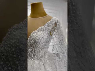 Step into a world of timeless elegance with this exquisite handmade ball gown, where classic design meets modern luxury. This stunning creation features a dramatic cape sleeve design that flows gracefully from the shoulders, creating an ethereal silhouette that moves with you like a soft whisper. The luxurious sparkle tulle fabric shimmers with every step, while intricate beaded details—hand-applied in delicate floral and scroll motifs—adorn the bodice and cape, catching the light to ensure you glow throughout your celebration.