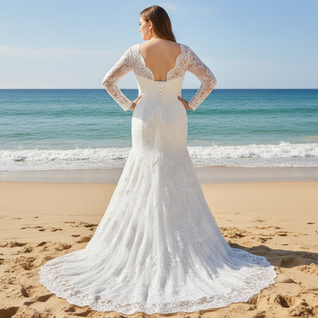 Sheer Long Sleeve V-neck Mermaid Lace Plus Size Wedding Dress