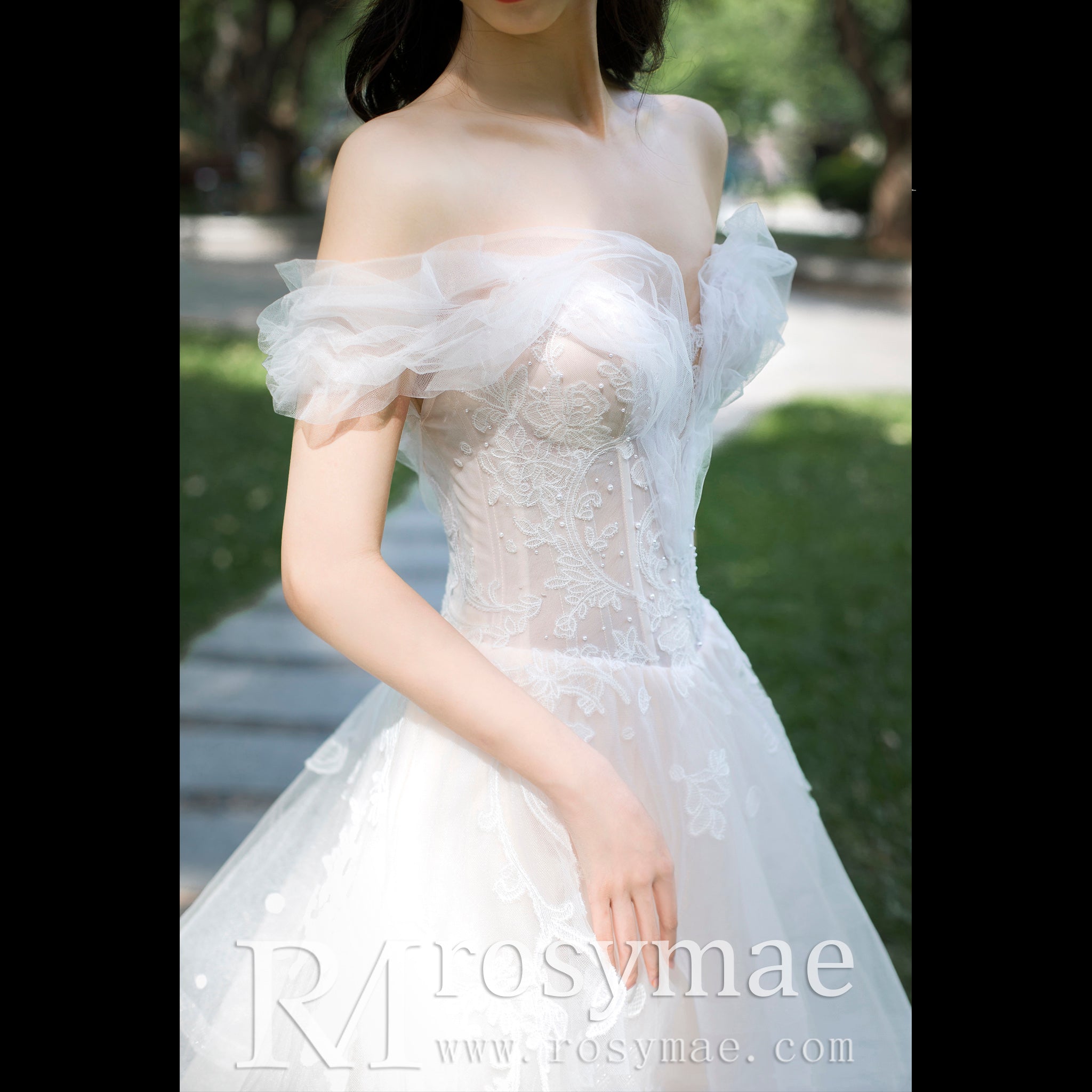 Tulle Off the Shoulder A Line Wedding Dress with Lace Applique