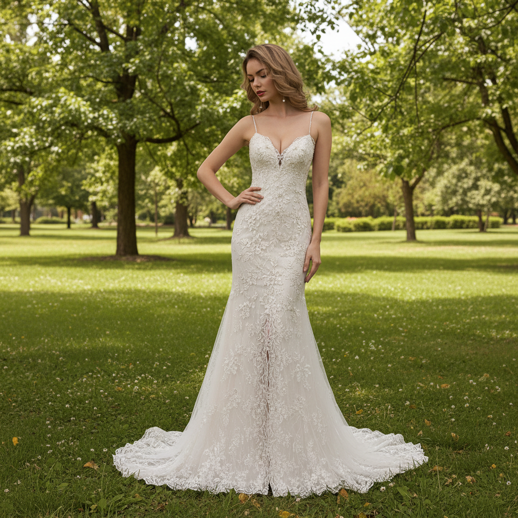 Spaghetti Strap V-neck Slit Mermaid Lace Wedding Dress