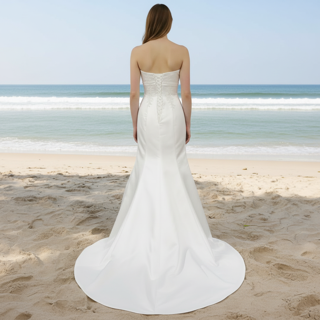 This exquisite strapless satin wedding gown combines timeless elegance with contemporary sophistication. Crafted from luxurious satin fabric, the dress features a refined straight silhouette that flatters the figure while maintaining an understated grace. The modest mid-back design offers both coverage and allure, striking the perfect balance between classic bridal aesthetics and modern sensibility. The mermaid silhouette gracefully hugs the body through the bodice and hips before flowing into a dramatic skirt, creating a stunning visual impact as you move. A chapel-length train adds ceremonial grandeur and photographic drama without overwhelming the overall composition. The strapless neckline showcases the shoulders and collarbone, allowing for versatile styling options with jewelry and veils. Ideal for brides seeking a sophisticated, timeless statement piece, this gown delivers the polish and presence expected of a premium wedding dress while maintaining an elegant restraint that photographs beautifully and feels comfortable throughout your celebration.