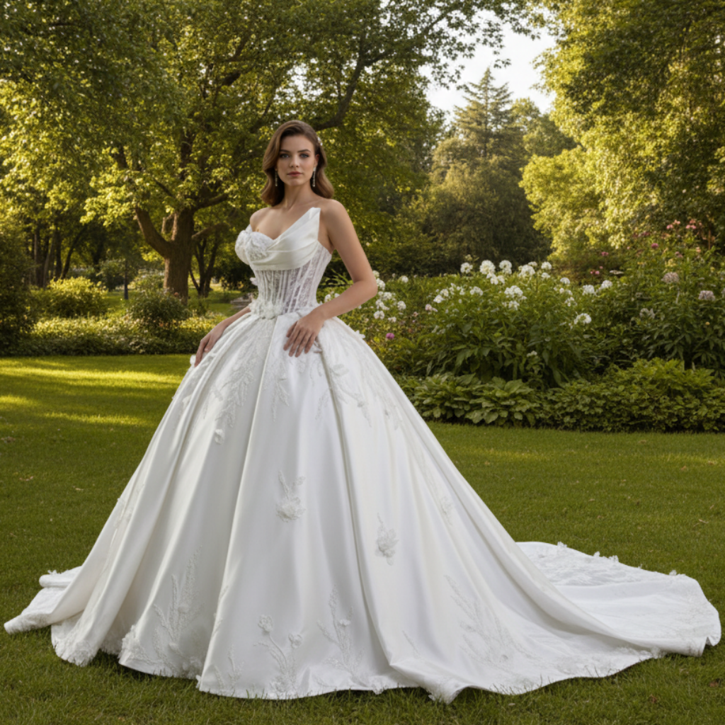 This one-shoulder ball gown wedding dress is an exceptional choice for brides who desire a blend of bold modernity and timeless elegance. The sculptural off-the-shoulder neckline, highlighted by a dramatic asymmetric puffed sleeve, commands attention and sets a striking silhouette. The fitted bodice, detailed with sheer panels and intricate boning, provides exceptional structure while adding a touch of contemporary attractive. Luxurious satin shapes the voluminous skirt, which is beautifully adorned with cascading delicate floral embroidery, evoking a sense of romantic sophistication. Completing the design, a majestic train flows gracefully, amplifying the gown’s grandeur and ensuring a breathtaking entrance. Perfectly suited for formal ceremonies and receptions, this gown not only highlights your unique style but also offers comfort and confidence throughout your special day. Its masterful combination of architectural design and delicate embellishments makes it a timeless piece that will be cherished for years to come, ensuring you leave a lasting impression on everyone present.