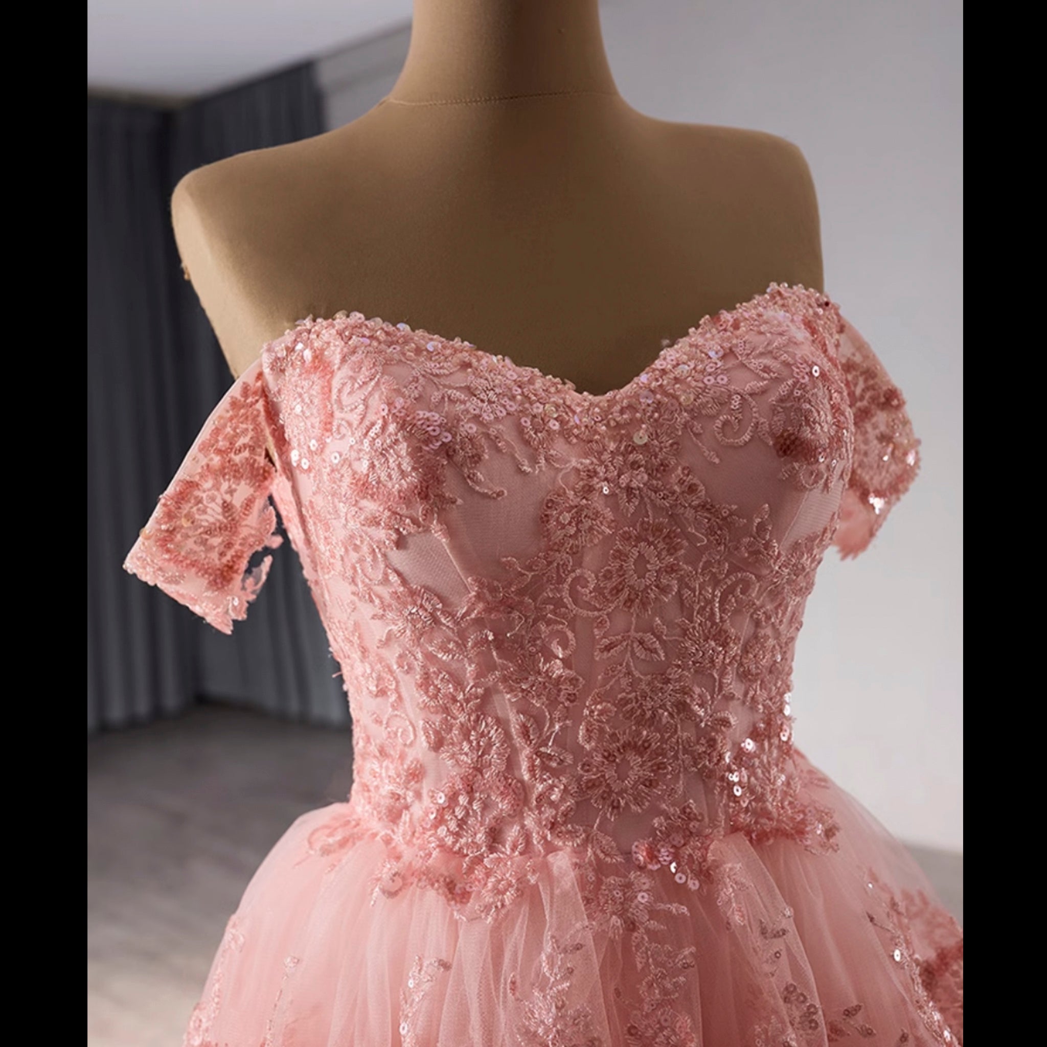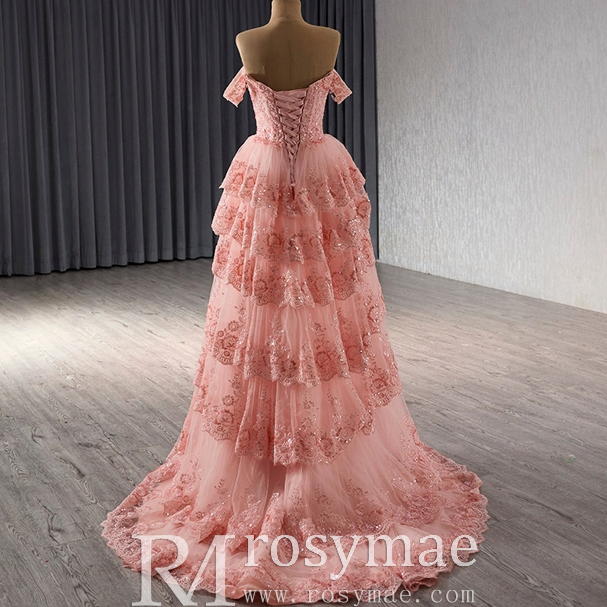 Celebrate in style with this handmade A-line floral lace applique birthday princess formal gown and party dress! Featuring an elegant off the shoulder design, sparkly lace detailing, and a multi-layered skirt, this dress is perfect for any special occasion. With a stunning low back and corset for the perfect fit, you'll be the center of attention. Available in pink and a v-neckline, this dress is truly excellent.