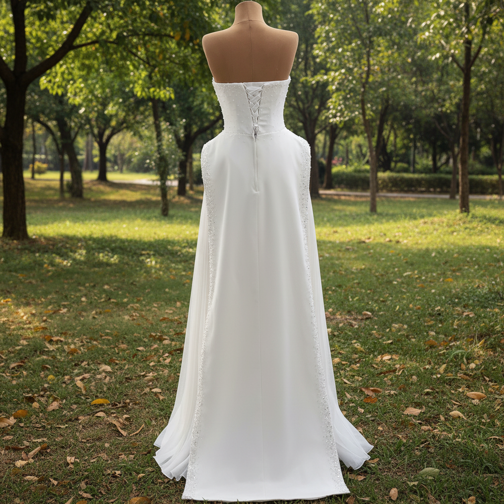 Realza tu estilo nupcial con este sofisticado vestido de novia entallado en un delicado tono rosa suave. Diseñado para acentuar una silueta elegante y estilizada, el vestido presenta un corpiño esculpido, meticulosamente adornado con delicadas perlas, que le otorga un brillo sutil y elegante que captura la luz con belleza. Su encanto contemporáneo se realza con aberturas laterales estructuradas, artísticamente superpuestas con inserciones de gasa plisada que crean un efecto único de sobrefalda ilusión, realzando la figura a la vez que aportan movimiento y profundidad. La sofisticada espalda con cordones no solo garantiza un ajuste perfecto, sino que también aumenta la comodidad y la facilidad durante todo tu día especial. Confeccionado para la novia moderna que busca el equilibrio perfecto entre líneas limpias y elementos artísticos audaces, este vestido encarna la elegancia minimalista entrelazada con la sofisticación vanguardista. Más allá de las bodas, su diseño versátil lo convierte en una opción exquisita para eventos formales, graduaciones o fiestas elegantes, permitiéndote destacar con confianza y estilo. Los suaves detalles de volantes añaden un toque de textura romántica, completando un look refinado y memorable.