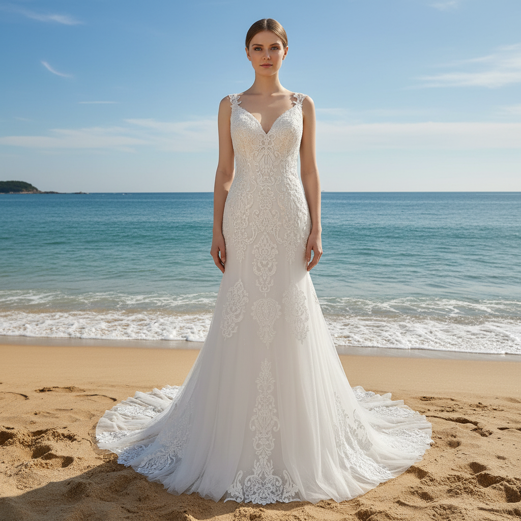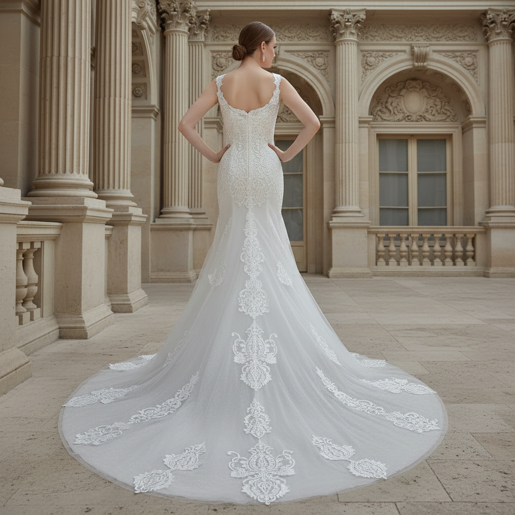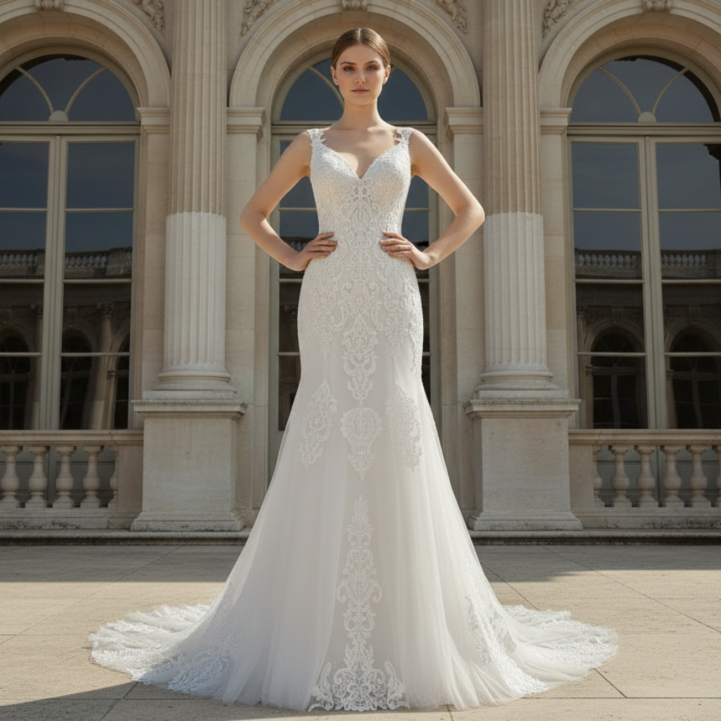 Este precioso vestido de novia de corte sirena es una verdadera obra maestra de elegancia y romanticismo, diseñado para que cada novia se sienta extraordinaria en su día especial. Con un favorecedor escote en V y delicados tirantes, el vestido realza la silueta natural, ensanchándose con gracia desde las caderas para crear un cautivador efecto sirena que irradia una sofisticación atemporal. El intrincado encaje floral cubre todo el vestido, añadiendo una rica textura y un sutil encanto romántico que atrae todas las miradas. Confeccionado por expertos con una meticulosa atención al detalle, este vestido combina una comodidad de lujo con un estilo impecable, permitiéndote moverte con libertad y confianza durante toda la celebración. La perfecta fusión de belleza clásica y estilo moderno del diseño lo convierte en la opción ideal para novias que buscan una estética refinada y contemporánea. Ideal tanto para ceremonias elegantes como para recepciones animadas, este vestido promete convertirte en el centro de atención, asegurando que cada momento de tu boda esté lleno de gracia, porte y un encanto inolvidable.
