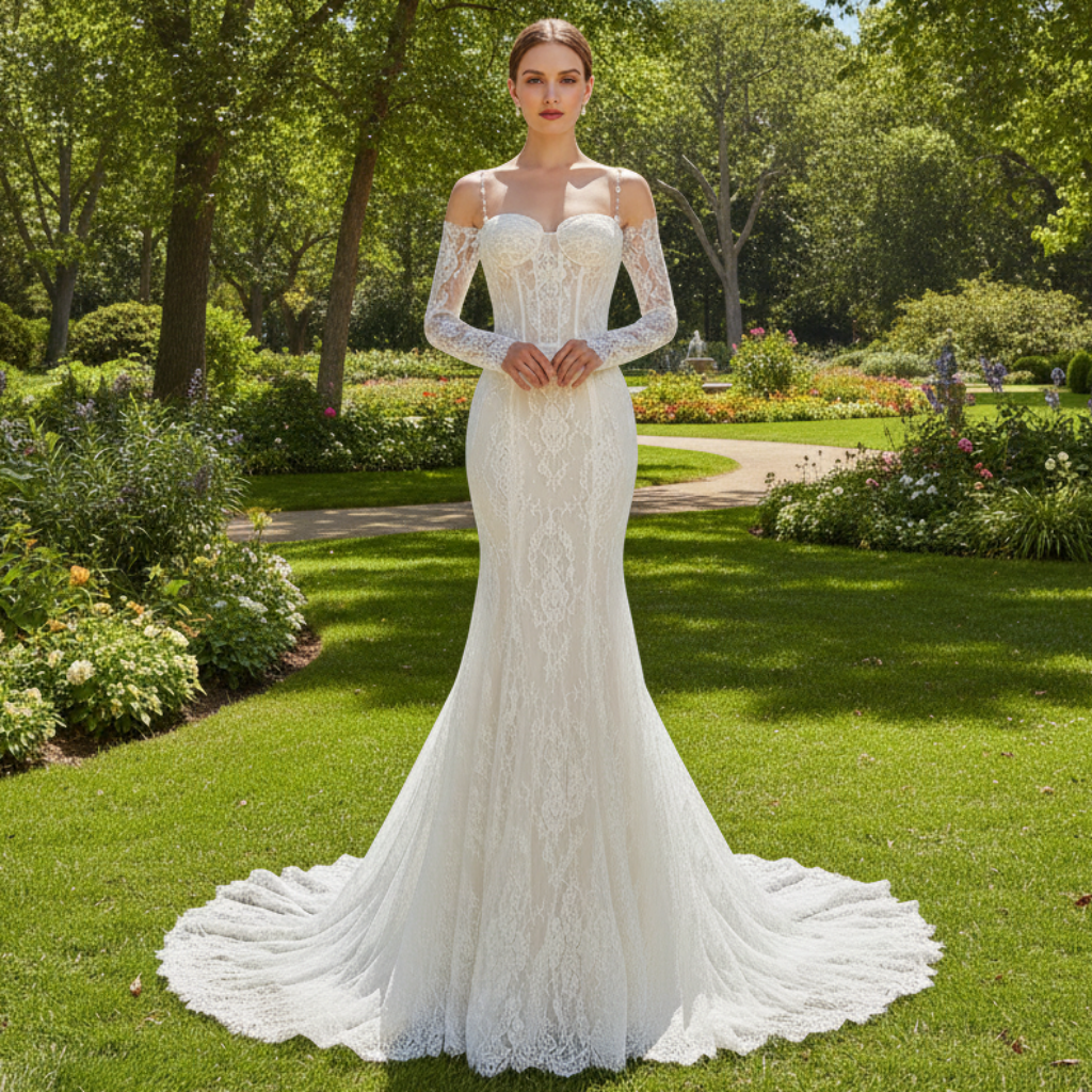 ¡Realza tu look nupcial con este vestido de novia de encaje! Con un diseño intrincado, una silueta sirena y una impresionante capa de encaje, este vestido te hará sentir como si hubieras soñado. El corpiño transparente y los delicados tirantes finos añaden un toque de sensualidad, mientras que la cola capilla crea un look elegante y atemporal. ¡Haz que tu boda sea inolvidable con este impresionante vestido!