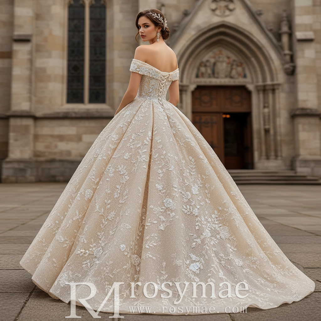 Adéntrate en un mundo de radiante elegancia con este exquisito vestido de novia hecho a mano, donde el glamour moderno se fusiona con la sofisticación atemporal. El lujoso tejido dorado champán brilla con un brillo suave y etéreo, mientras que el elegante diseño de hombros al descubierto enmarca bellamente tus clavículas y añade un toque de encanto romántico. La magnífica falda abullonada se transforma en una impresionante silueta de vestido de gala, confeccionada con capas de tul brillante que crean un volumen y un movimiento impresionantes a cada paso.