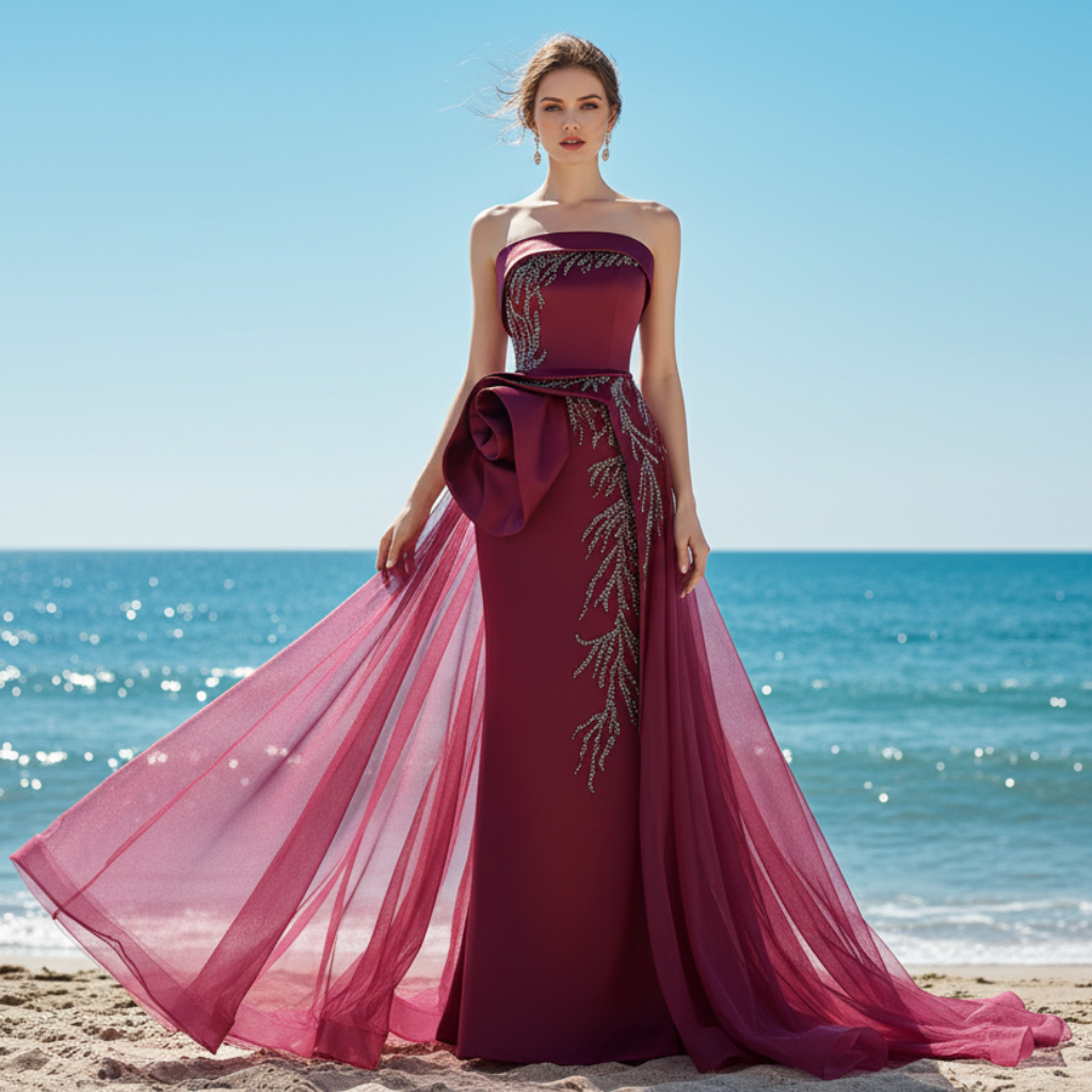Este llamativo vestido de noche presenta un lujoso color burdeos, intrincados detalles hechos a mano con cuentas y deslumbrantes lentejuelas. Con su diseño de alta gama y su excelente calidad, este vestido te hará destacar en cualquier evento y dejará una impresión duradera en todos los que te rodean. ¡Siéntete y luce elegante con esta pieza atemporal y glamurosa!