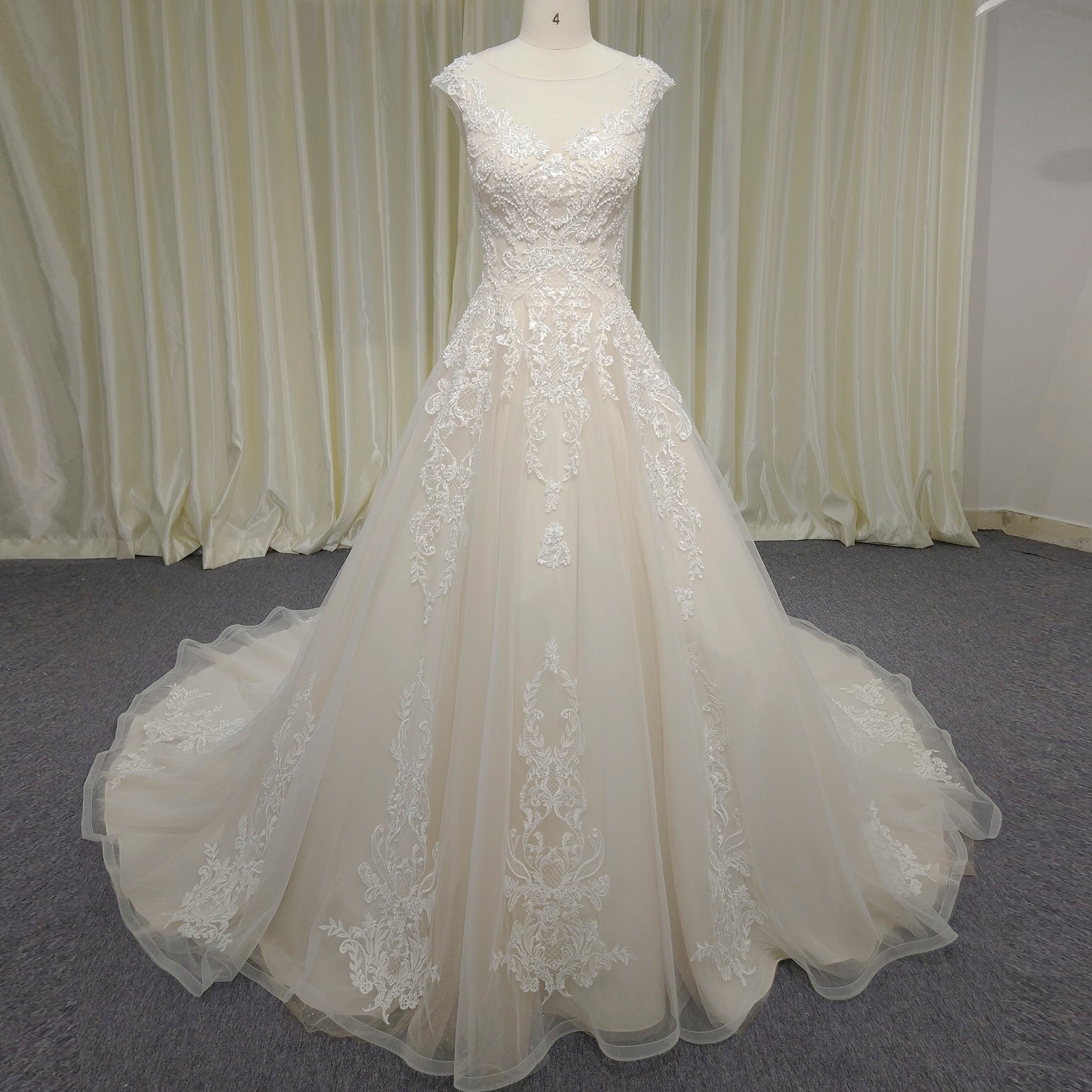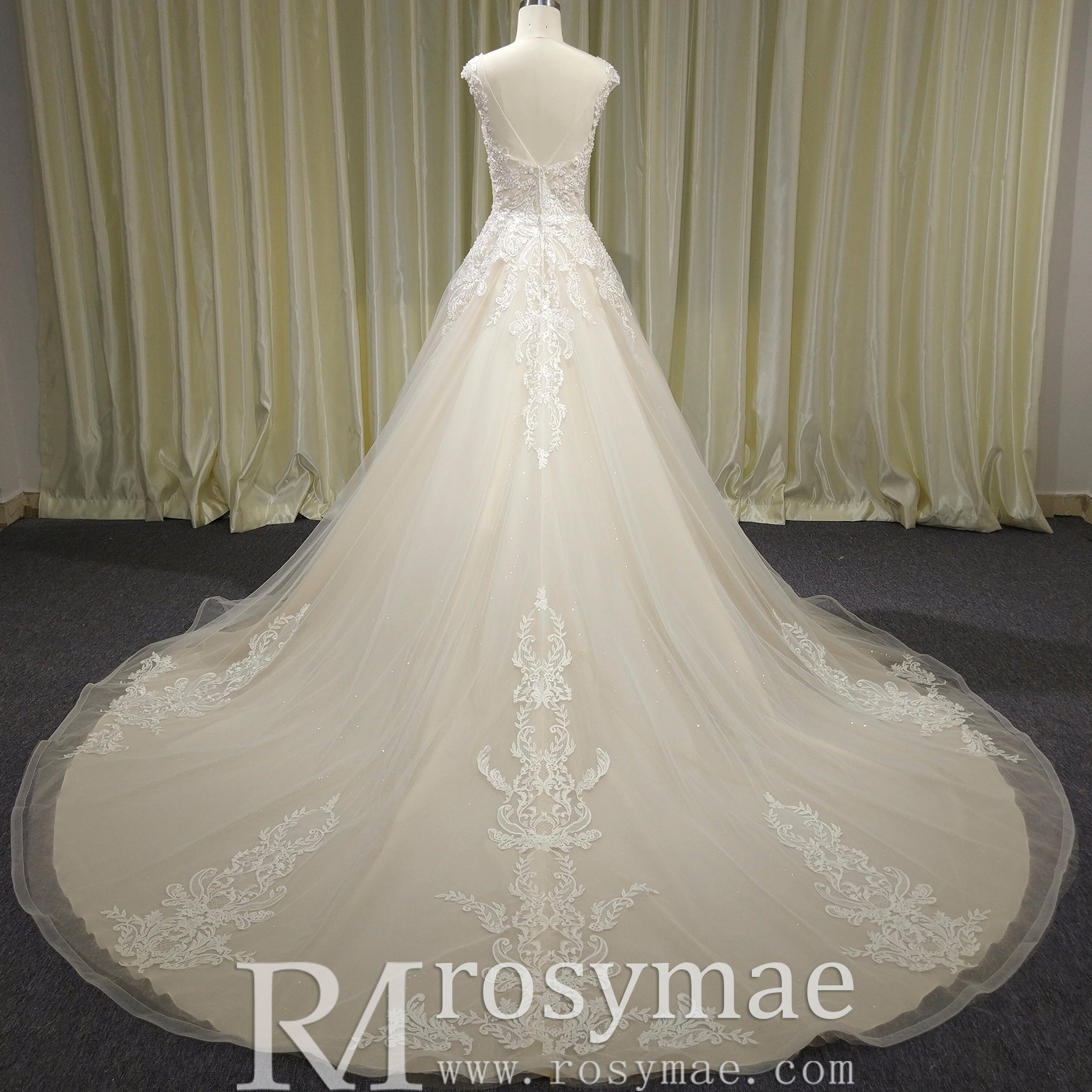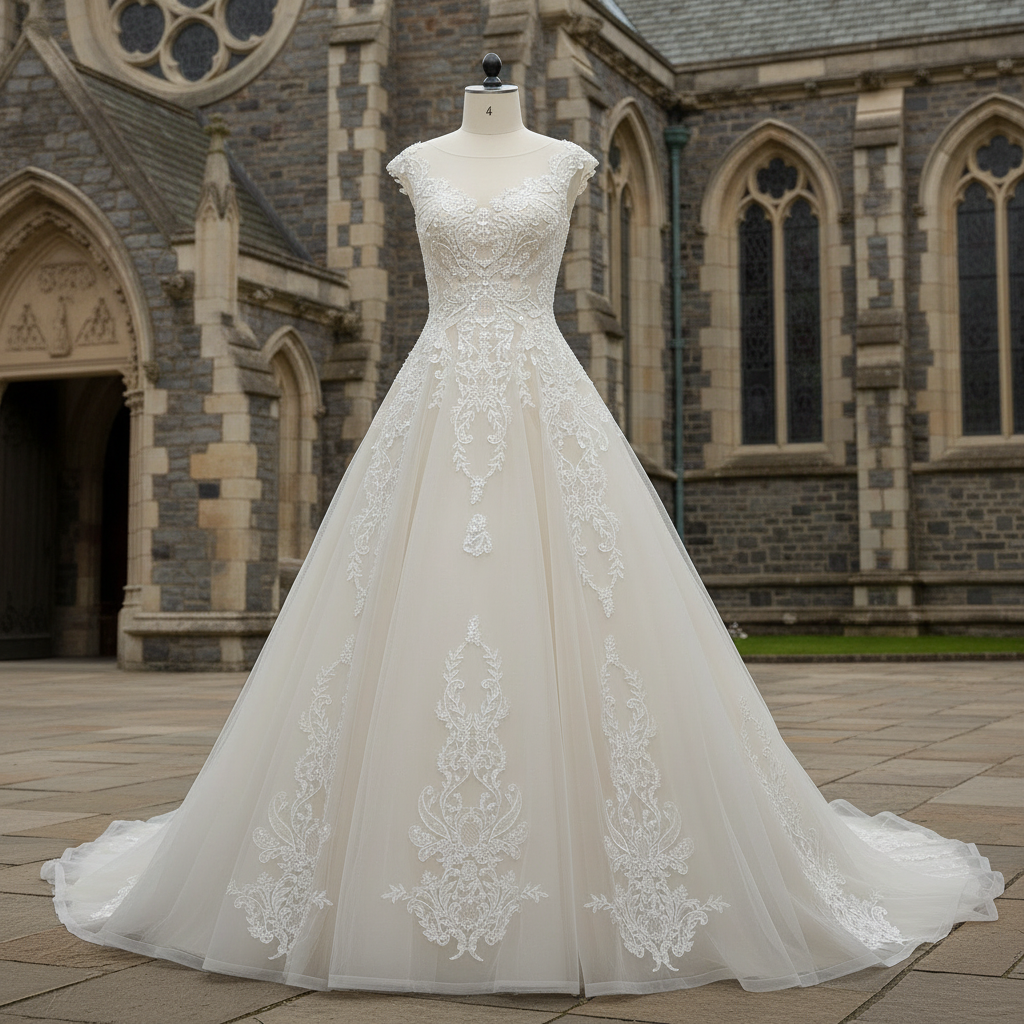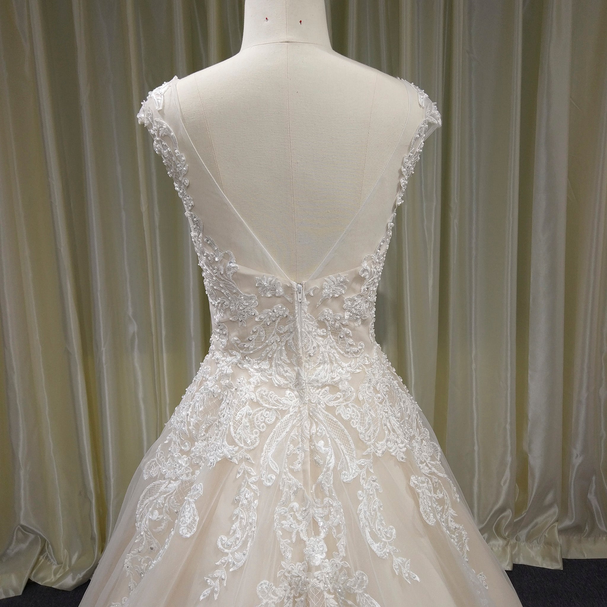 Este vestido de novia de tul corte A de inspiración vintage personifica la sofisticación atemporal, combinando un diseño clásico con detalles meticulosos. Su escote redondo transparente, sobre un corpiño corazón, crea una silueta elegante y favorecedora que realza el cuello y las clavículas. El vestido se ve realzado por aplicaciones de encaje floral cosidas a mano, cada una delicadamente adornada con cuentas que captan la luz, añadiendo profundidad y un brillo sutil a la tela. La elegante espalda baja introduce un atractivo moderno sin perder la esencia romántica del vestido. Las mangas casquillo añaden un toque refinado, acentuando suavemente los hombros y proporcionando una cobertura equilibrada. La fluida cola de longitud capilla completa la silueta con un aire de grandeza, perfecta para causar una impresión inolvidable. Confeccionado con precisión experta, este vestido ofrece a las novias una combinación perfecta de encanto vintage y artesanía refinada, ideal para quienes buscan belleza y elegancia perdurables en su día especial.