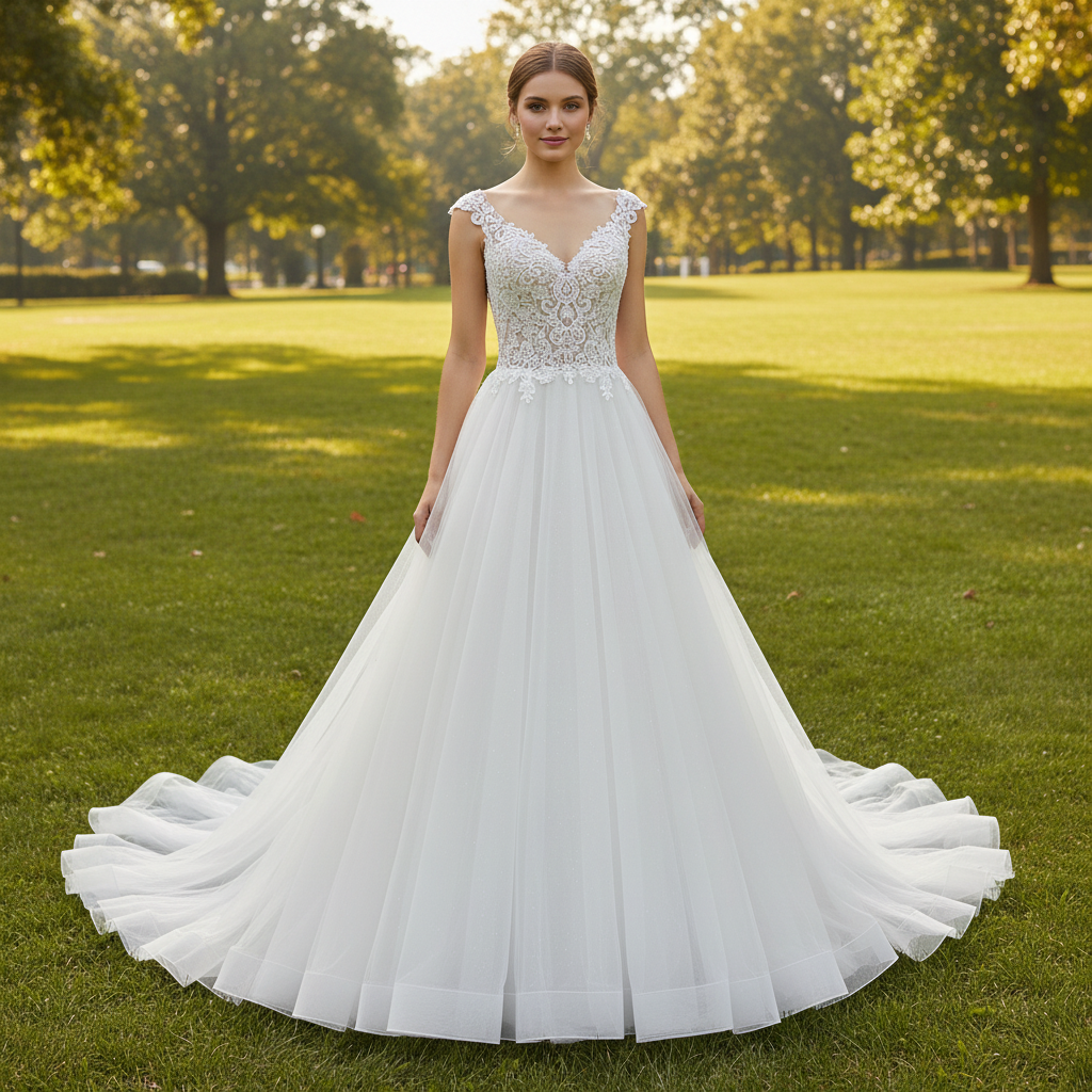 Luce espectacular en tu día especial con este exquisito vestido de novia de corte A, sin mangas y escote en V, que combina a la perfección la elegancia atemporal con el encanto romántico. La fluida falda de tul crea una silueta suave y etérea que se mueve con gracia a cada paso, mientras que los delicados apliques de encaje floral añaden una belleza intrincada y una sofisticación duradera. El favorecedor escote en V realza tu escote, perfectamente equilibrado por el estilo de la camiseta sin mangas, que ofrece una sujeción cómoda con un toque contemporáneo. Meticulosamente elaborado con telas de alta calidad, este vestido te garantiza sentirte segura y radiante desde el altar hasta el último baile de tu celebración. Los cuidados detalles de diseño, como el sutil ribete de encaje y el tul transpirable, aportan estilo y comodidad, haciéndolo ideal para lucir durante todo el día. Su atractivo clásico pero glamuroso lo convierte en una opción memorable para las novias que buscan un vestido que brille con gracia e individualidad. Sumérgete en el encanto del día de tu boda con un vestido que combina texturas de ensueño, elegantes adornos y un corte favorecedor, diseñado para resaltar tu belleza única. Crea momentos inolvidables envuelta en un vestido tan extraordinario como tu historia de amor, diseñado para hacerte sentir realmente deslumbrante en cada paso del camino.