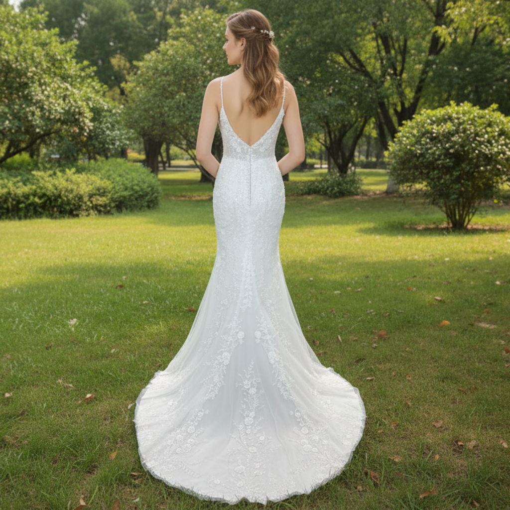 Experimenta una elegancia sin igual con este vestido de novia corte sirena de encaje y tirantes finos, diseñado para encarnar la belleza atemporal y la sofisticación moderna. Los delicados tirantes finos perfilan suavemente tus hombros, enmarcando a la perfección el elegante escote y realzando tu atractivo natural. Un profundo escote en V añade un toque romántico y cautivador, atrayendo la mirada hacia tu escote con una seducción sutil. El corpiño luce intrincados detalles de encaje que irradian un encanto vintage, artísticamente confeccionado para ciñirse a la cintura, acentuando tus curvas femeninas con una silueta favorecedora. Este vestido cae en una larga y majestuosa cola que añade dramatismo y grandeza a tu entrada a la iglesia, creando momentos inolvidables. Con su perfecta combinación de elementos clásicos y un corte contemporáneo, este vestido promete no solo un look deslumbrante, sino también una comodidad y confianza excepcionales durante todo tu día especial. Ideal para novias que aprecian el estilo refinado y el glamour atemporal, este vestido te asegura cautivar todas las miradas mientras celebras este momento único en la vida con absoluta luminosidad.