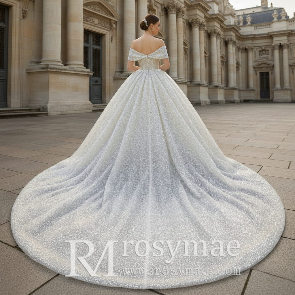 Vestido de novia brillante con falda abullonada y hombros descubiertos