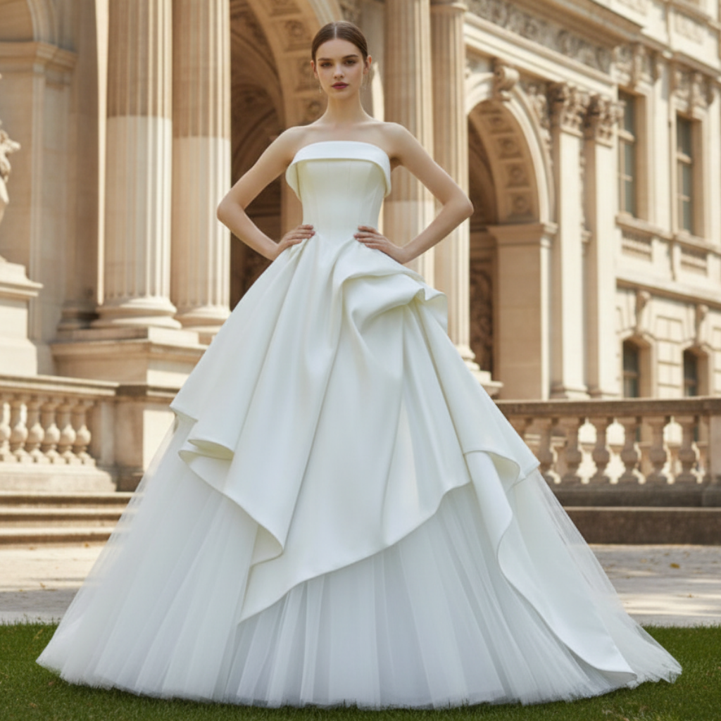 ¡Dale un toque de estilo a tu día especial con este impresionante vestido de novia sin tirantes! Este vestido, confeccionado en lujoso satén y tul, presenta un escote recto y una espalda baja que le da un aspecto elegante y estilizado. El detalle de volantes le da un toque romántico y te hará sentir como una verdadera princesa. ¡Haz tu pedido ahora para que tu boda de cuento de hadas se haga realidad!