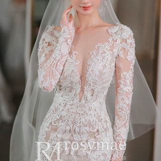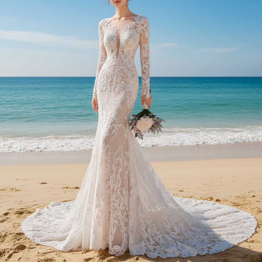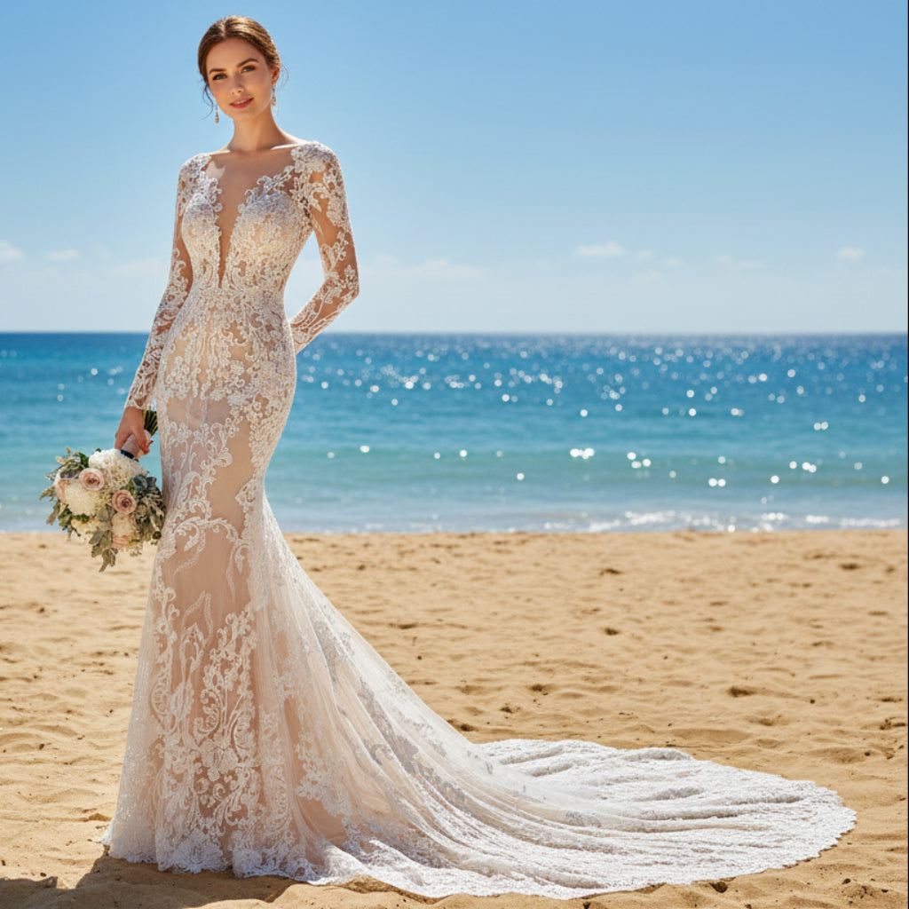 Este elegante vestido de novia de encaje con vuelo y manga larga presenta un favorecedor escote en V con una capa transparente y pedrería intrincada, creando una impresionante silueta de sirena. El vestido también incluye una cola capilla, añadiendo un toque de romance tradicional. Perfecto para una novia sofisticada que busca un look clásico y favorecedor.