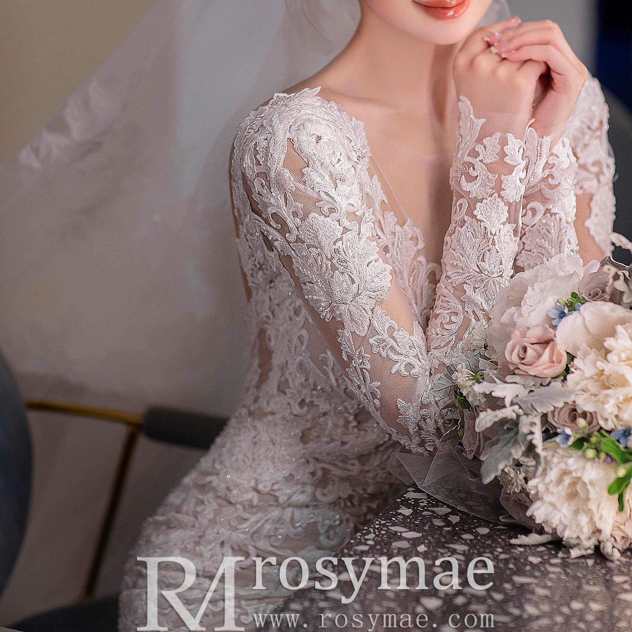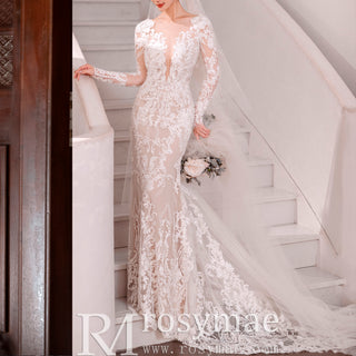 Vestido de novia de encaje con vuelo y manga larga con cuello en V