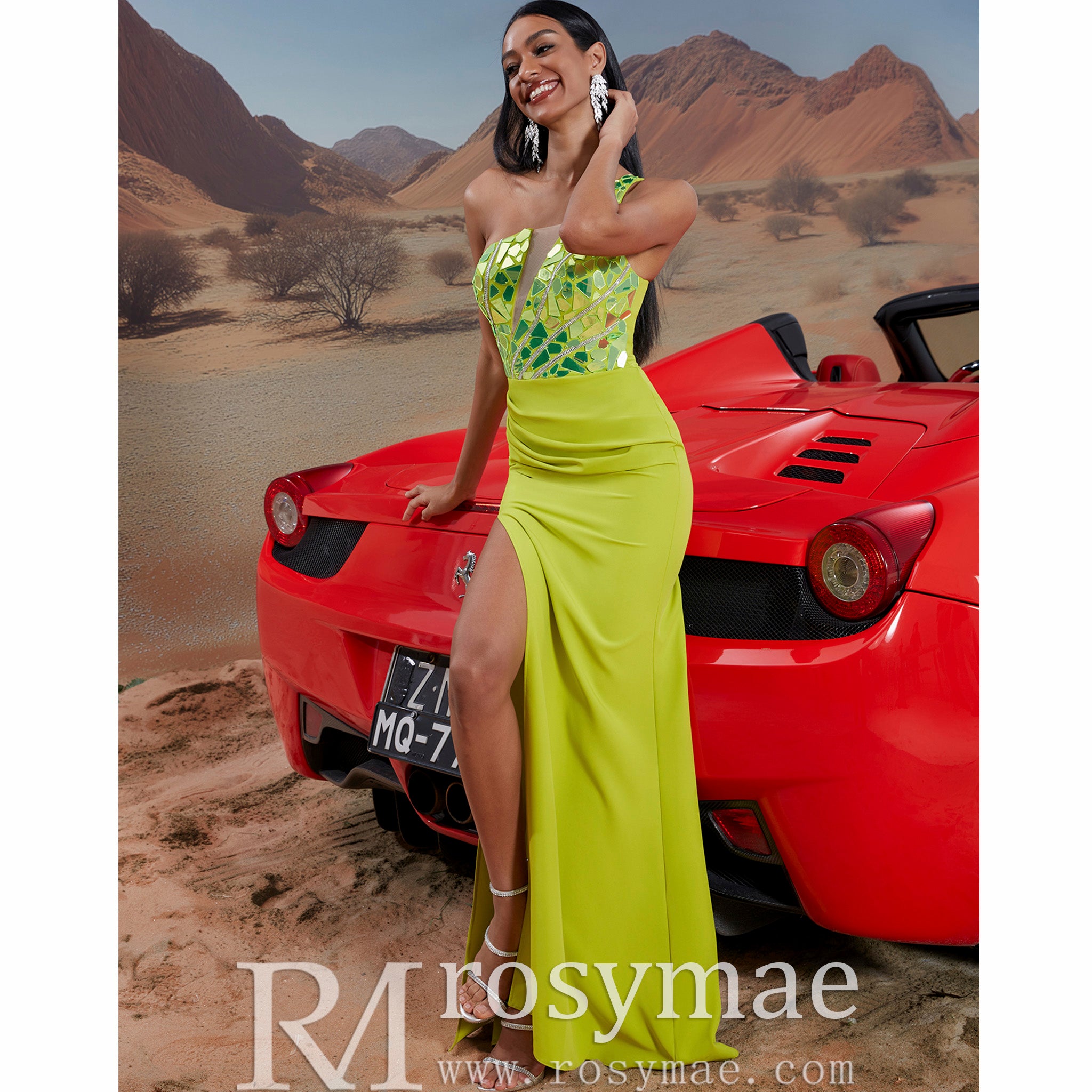 Vestido de fiesta largo con un hombro descubierto y abertura en la pierna con purpurina BP057