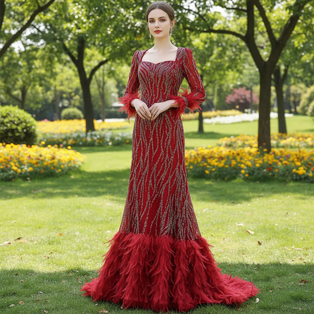 ¡Prepárate para llamar la atención con este impresionante vestido de noche de plumas de manga larga color burdeos! El escote cuadrado y los detalles de pedrería añaden un toque de elegancia, mientras que las mangas largas y los detalles de plumas aportan un elemento único y llamativo a este vestido. Perfecto para una fiesta de graduación o cualquier evento especial, este vestido seguramente te hará sentir segura y hermosa.