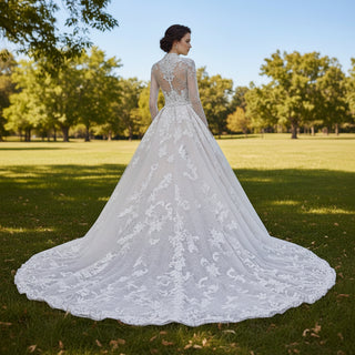 Vestido de novia de manga larga con corpiño transparente y superposición de encaje