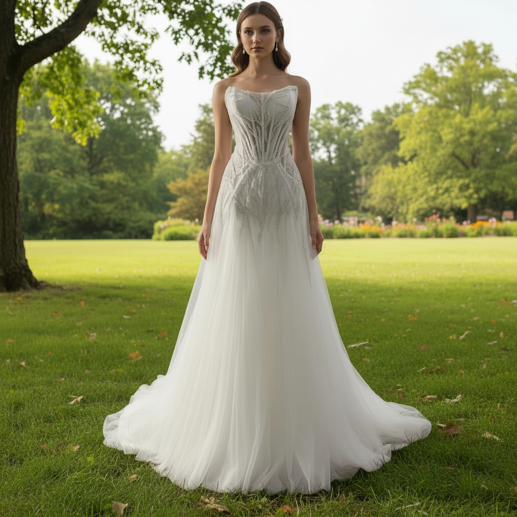 Este vestido de novia princesa de corte A, transparente, irradia sofisticación con su diseño sin tirantes, sin mangas y con espalda descubierta, que enmarca a la perfección los hombros y la espalda para una silueta favorecedora. El corpiño presenta un intrincado entramado de cuentas que añade textura y profundidad refinadas, captando la luz con belleza para realzar tu brillo natural. Confeccionada en tul suave y fluido, la falda crea una silueta ligera y soñadora que se mueve con gracia a cada paso, evocando una sensación de encanto etéreo. Una larga y elegante cola añade un toque de encanto y grandeza atemporales, convirtiendo este vestido en una opción excepcional para bodas en la playa o eventos nupciales discretos. Combinando un diseño minimalista con delicados adornos, este vestido ofrece un look sereno y elegante sin esfuerzo que te hará sentir radiante y segura en tu día especial. Su tejido transpirable y su corte expertamente confeccionado te proporcionarán comodidad durante toda la celebración, mientras que el sutil brillo de las lentejuelas añade el toque justo de glamour. Ya sea caminando hacia el altar o asistiendo a un evento formal por la noche, este vestido promete dejar una impresión duradera con su combinación de belleza clásica y sofisticación moderna.