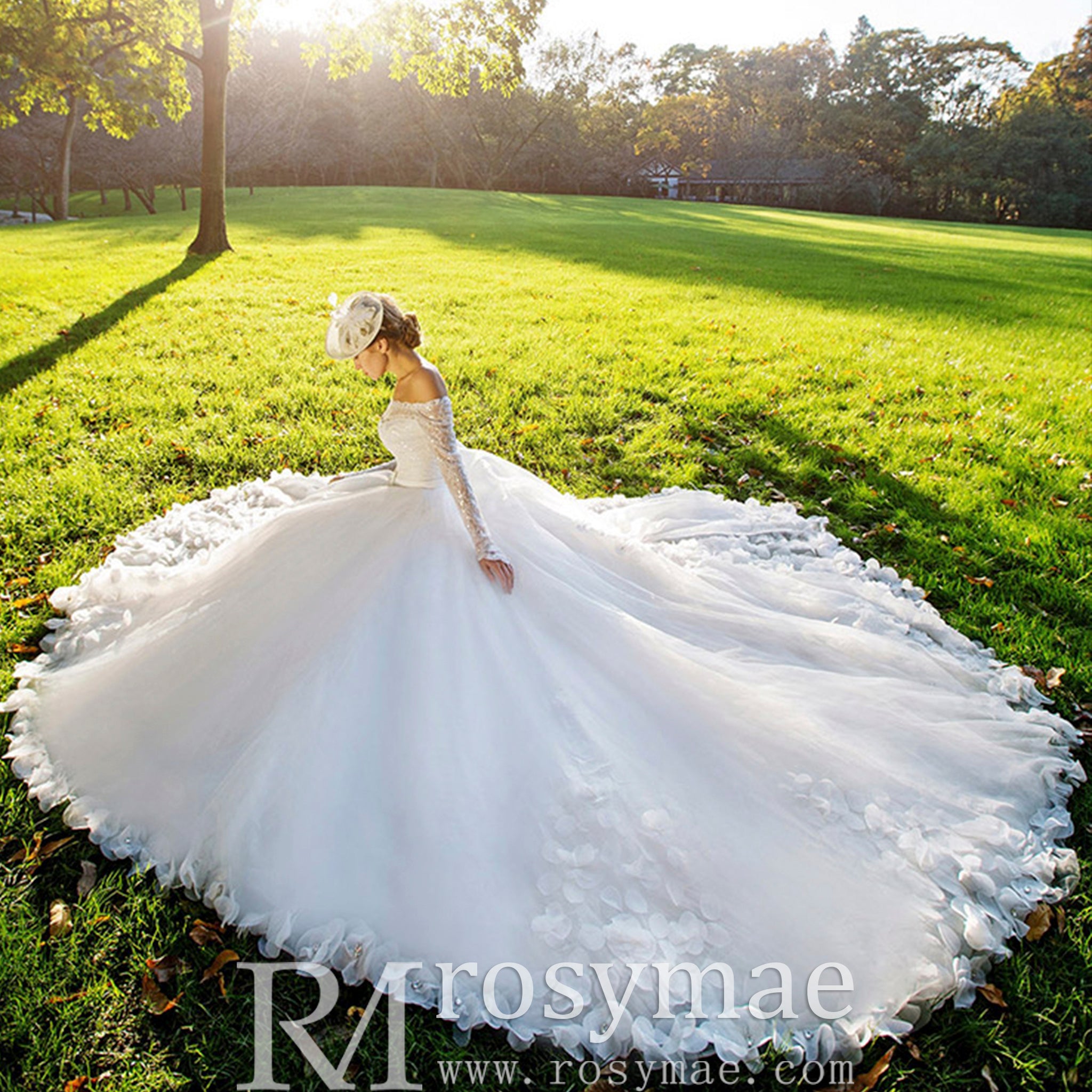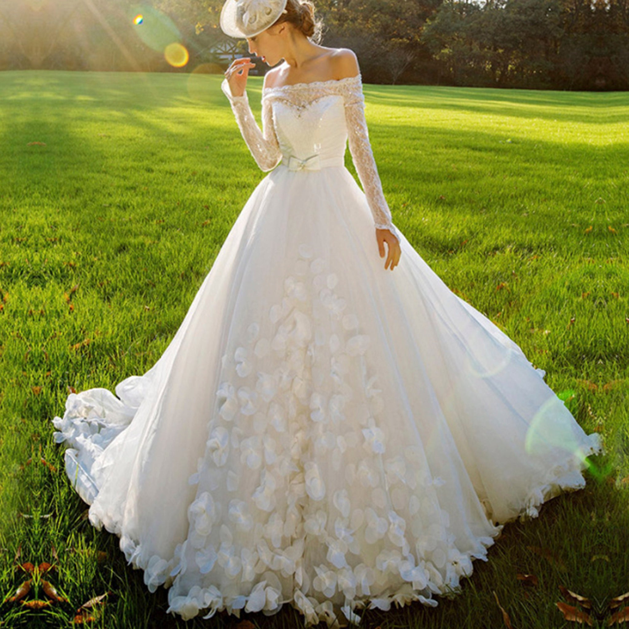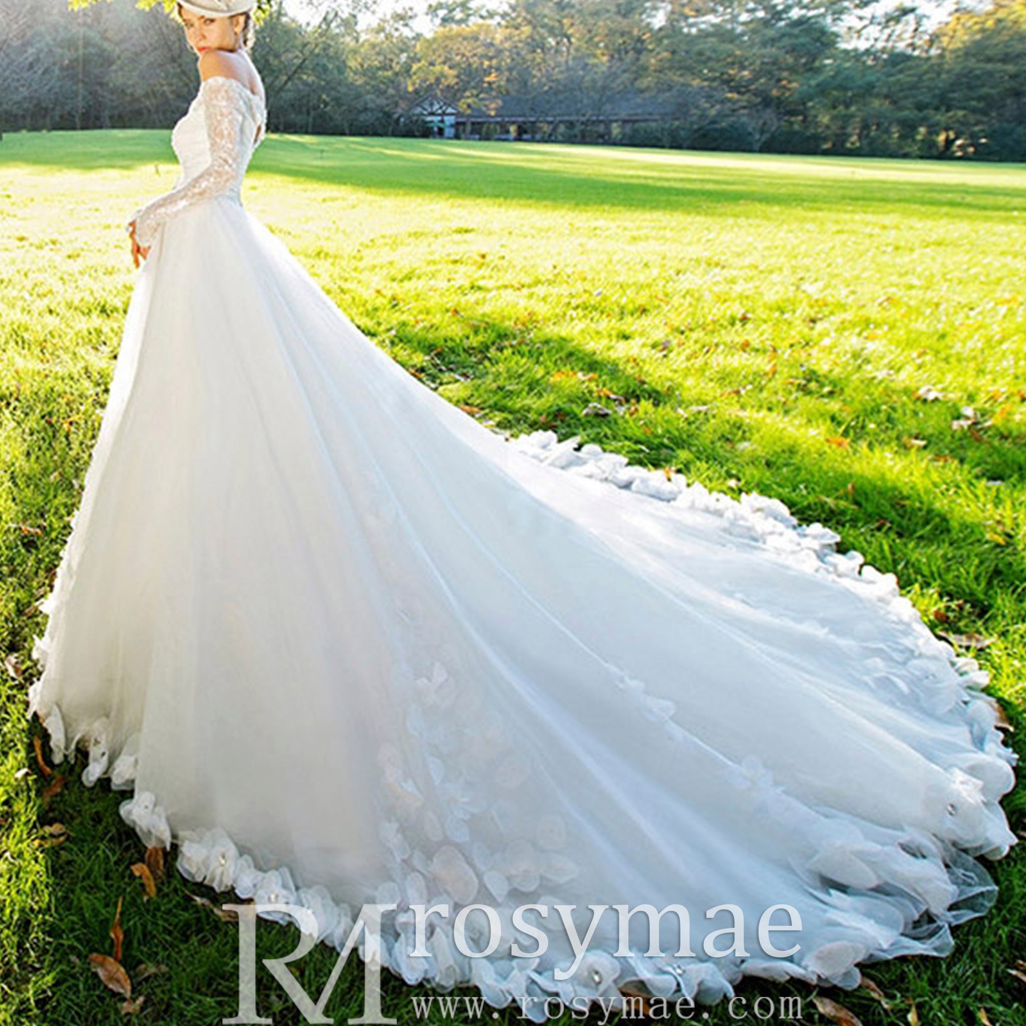 Este impresionante vestido de novia luce flores hechas a mano delicadamente adheridas a la falda de tul, añadiendo un toque de elegancia a tu día especial. Las mangas largas con hombros descubiertos y la cola catedral crean un look atemporal y romántico. Los detalles hechos a mano y la silueta favorecedora del vestido de gala hacen de este vestido una prenda imprescindible para cualquier novia.
