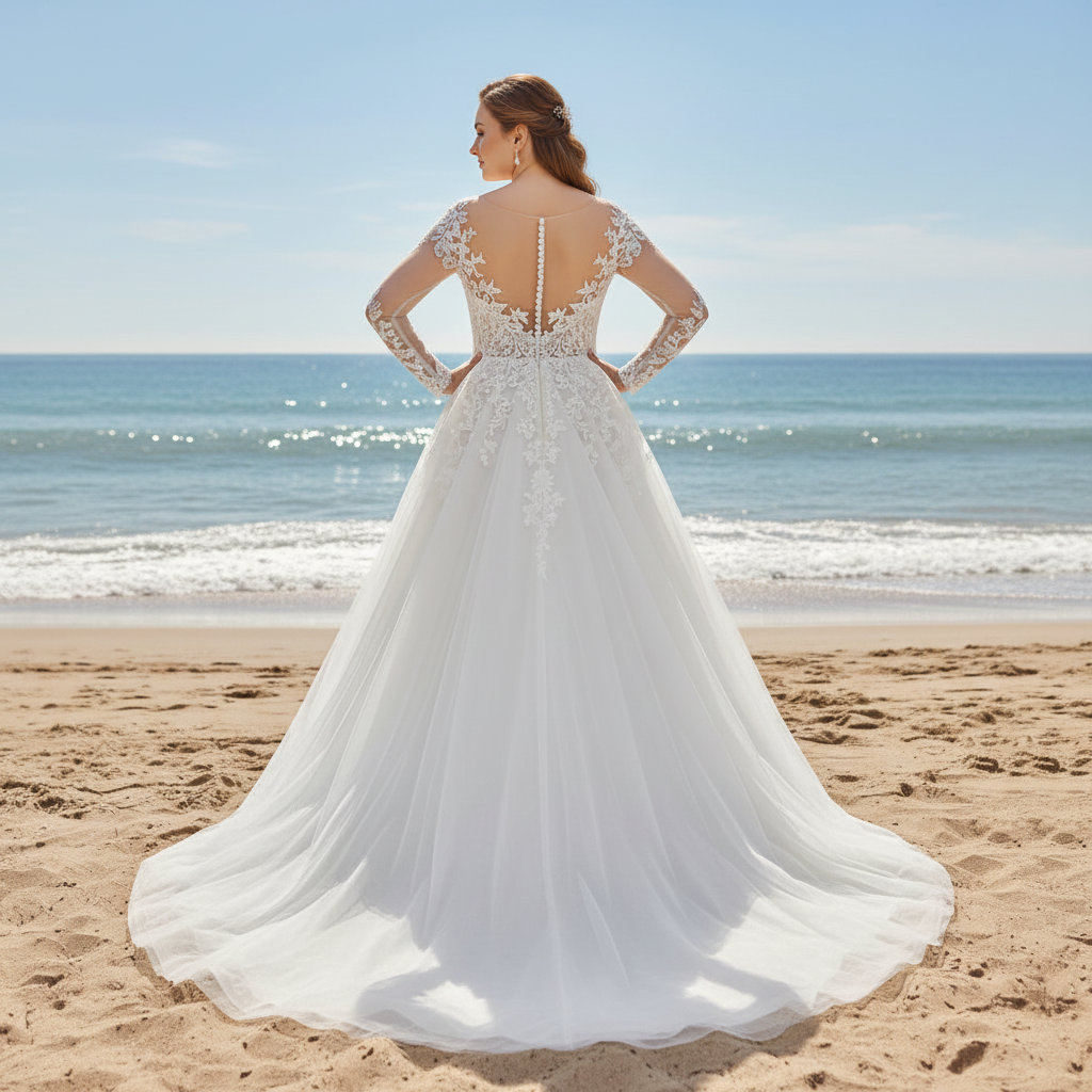 Realza tu visión nupcial con este exquisito vestido de novia de talla grande, meticulosamente elaborado para una elegancia atemporal y una sofisticación moderna. Su romántica silueta presenta un elegante corte en A que favorece y fluye con belleza, mientras que el escote ilusión transparente y las mangas largas crean una estética etérea y femenina. Lujosas capas de tul suave conforman la voluminosa falda, adornada con delicados apliques de encaje floral que añaden dimensión e interés visual. La espalda ilusión transparente está acentuada con una impresionante línea de perlas, un detalle cautivador para tu gran entrada. Una cola capilla completa el look dramático y clásico. Este vestido combina a la perfección la artesanía nupcial tradicional con el diseño contemporáneo, lo que lo convierte en la opción ideal para la novia exigente que busca un vestido que llame la atención con una gracia discreta.