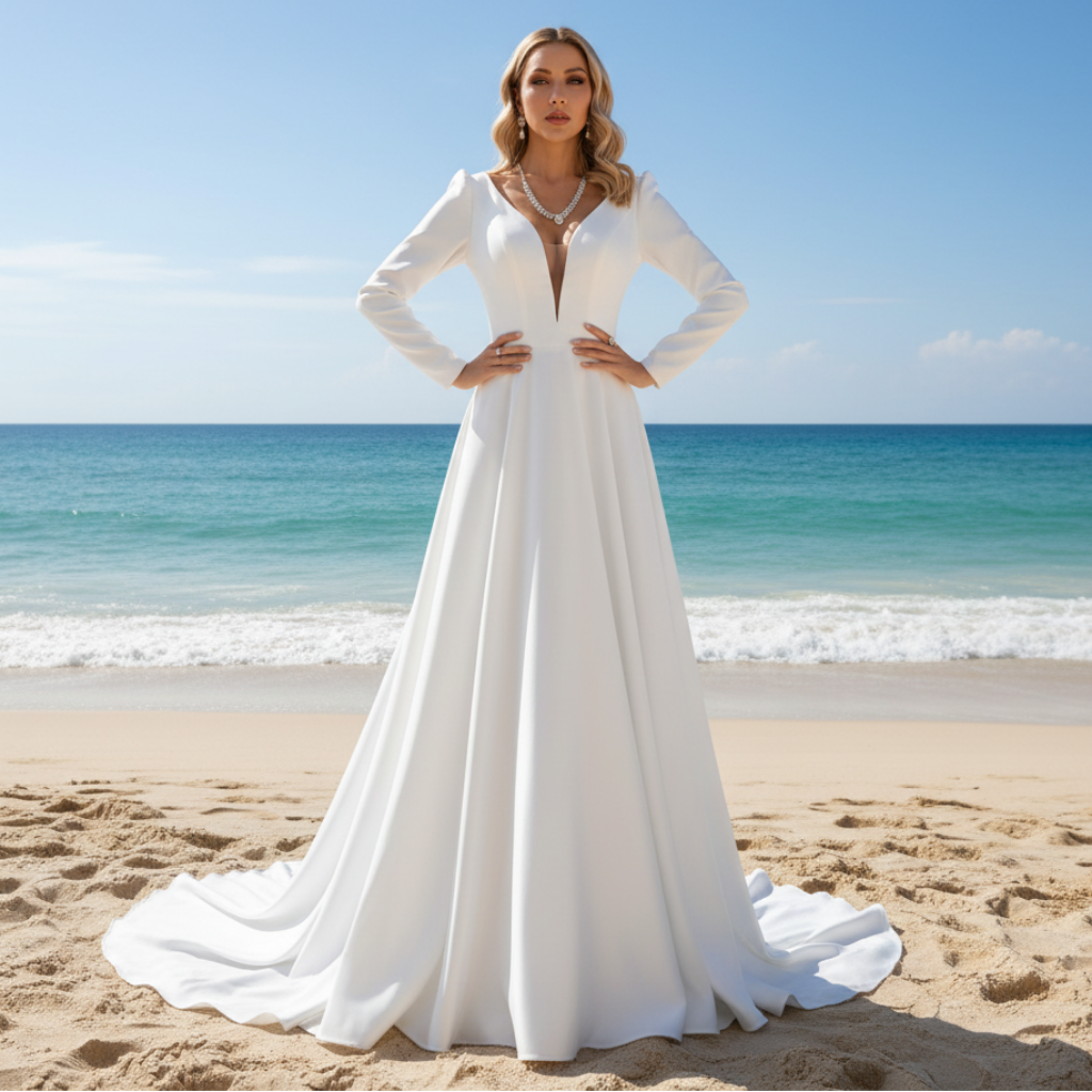Este vestido de novia único y moderno presenta una favorecedora silueta en forma de A que acentúa la cintura, creando con naturalidad una elegante figura de reloj de arena que te hará sentir única. Las sofisticadas mangas largas cubren con elegancia los hombros hasta las muñecas, adornadas con delicados botones que aportan un toque de encanto atemporal y sutil sensualidad. Confeccionado en satén sedoso de alta calidad, este vestido de novia ofrece una textura lujosamente suave que se siente delicada y cómoda sobre la piel, asegurándote seguridad y radiante durante todo tu día especial. El brillo natural del satén captura la luz con belleza, realzando la elegante simplicidad del vestido, a la vez que conserva un aura de gracia refinada. Su diseño minimalista te permite combinarlo fácilmente con accesorios llamativos o centrarte en el vestido para un look limpio y refinado. Combinando un diseño clásico con una elegancia moderna, este vestido es perfecto para novias que buscan una apariencia refinada pero impactante que dejará una huella imborrable en todos tus encuentros. Ya sea para caminar hacia el altar o para celebrar en la recepción, este vestido promete belleza atemporal y una comodidad inigualable.