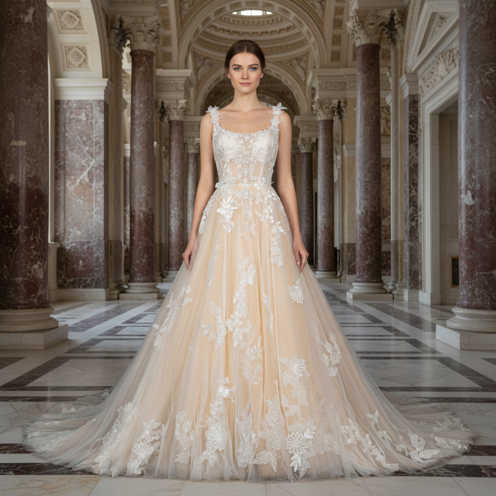 Este exquisito vestido de novia color crema combina una elegancia atemporal con detalles de diseño contemporáneo. El sofisticado escote cuadrado enmarca los hombros con belleza, mientras que el cuerpo y la espalda de tul transparente crean una silueta seductora y romántica. Delicadas aplicaciones de encaje brillante caen en cascada sobre la voluminosa falda, adornada con flores de encaje dimensionales que aportan profundidad y movimiento a cada paso. La suave confección en tul garantiza comodidad durante todo el día, mientras que los intrincados bordados de cuentas y adornos florales capturan la luz con gracia, creando un efecto luminoso y espectacular. Perfecto para novias que buscan un vestido que equilibre la estética nupcial clásica con la sofisticación moderna, este vestido ofrece la grandeza y el refinamiento que se esperan de un conjunto de boda de alta gama. El generoso volumen de la falda proporciona una presencia dramática sin comprometer la comodidad, lo que lo convierte en una opción ideal tanto para ceremonias tradicionales como para celebraciones contemporáneas.