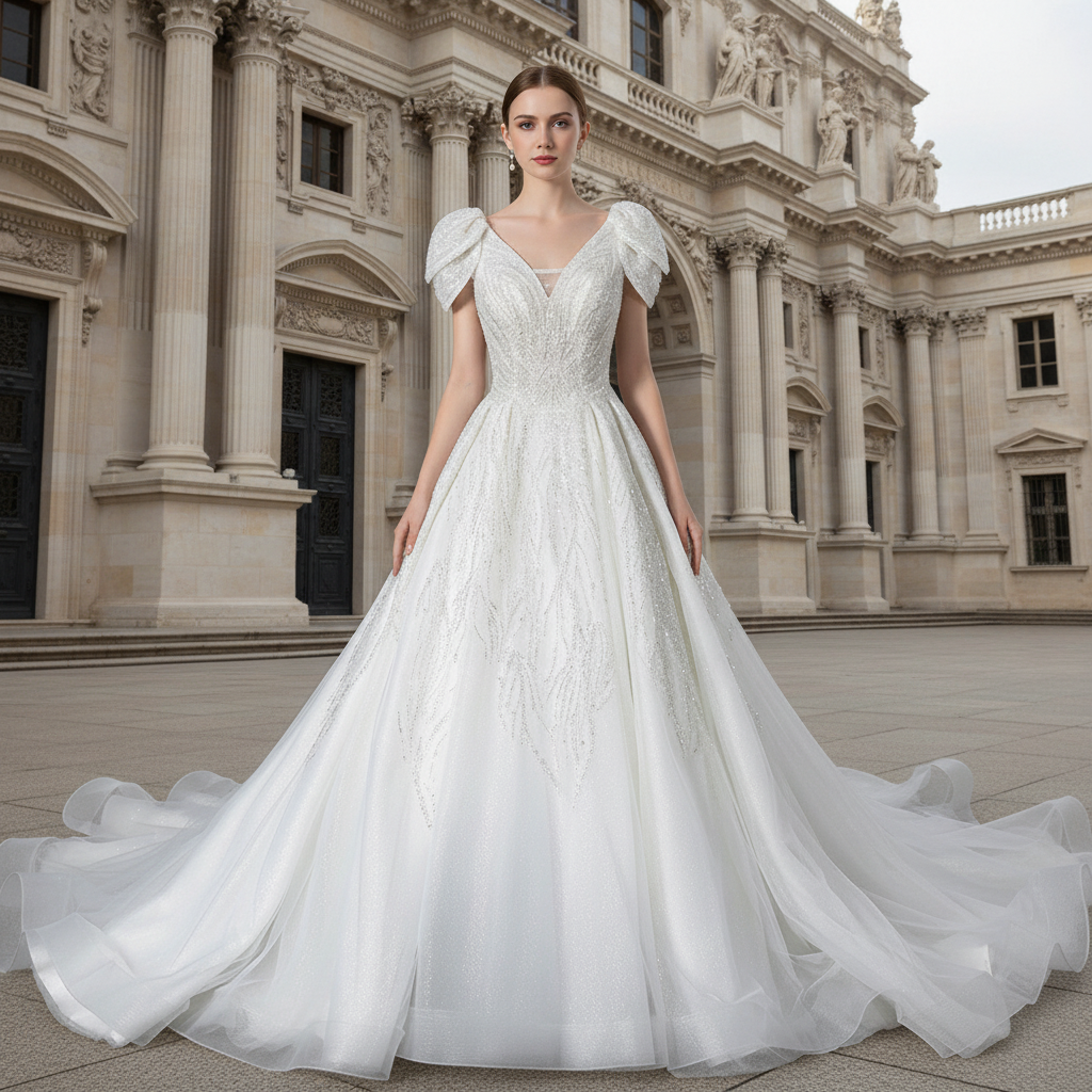Realza tu visión nupcial con este exquisito vestido de novia estilo gala, diseñado para capturar la luz y la admiración desde cualquier ángulo. El sofisticado escote en V y la espalda en V a juego crean una elegante silueta que favorece a diversos tipos de cuerpo, mientras que el corpiño con incrustaciones brillantes ofrece un glamour atemporal con un sutil brillo que queda perfecto en las fotografías. El suave tul se extiende con gracia sobre la cintura, proporcionando un movimiento cómodo y una transición refinada hacia la voluminosa falda. Múltiples capas de lujoso tul crean un volumen y una dimensión espectaculares, ofreciendo esa codiciada presencia de princesa al caminar hacia el altar. Las mangas cortas brindan una cobertura discreta y un toque romántico, mientras que la confección del vestido garantiza comodidad y confianza durante toda la celebración. Disponible en tallas grandes para que cada novia encuentre su talla perfecta.