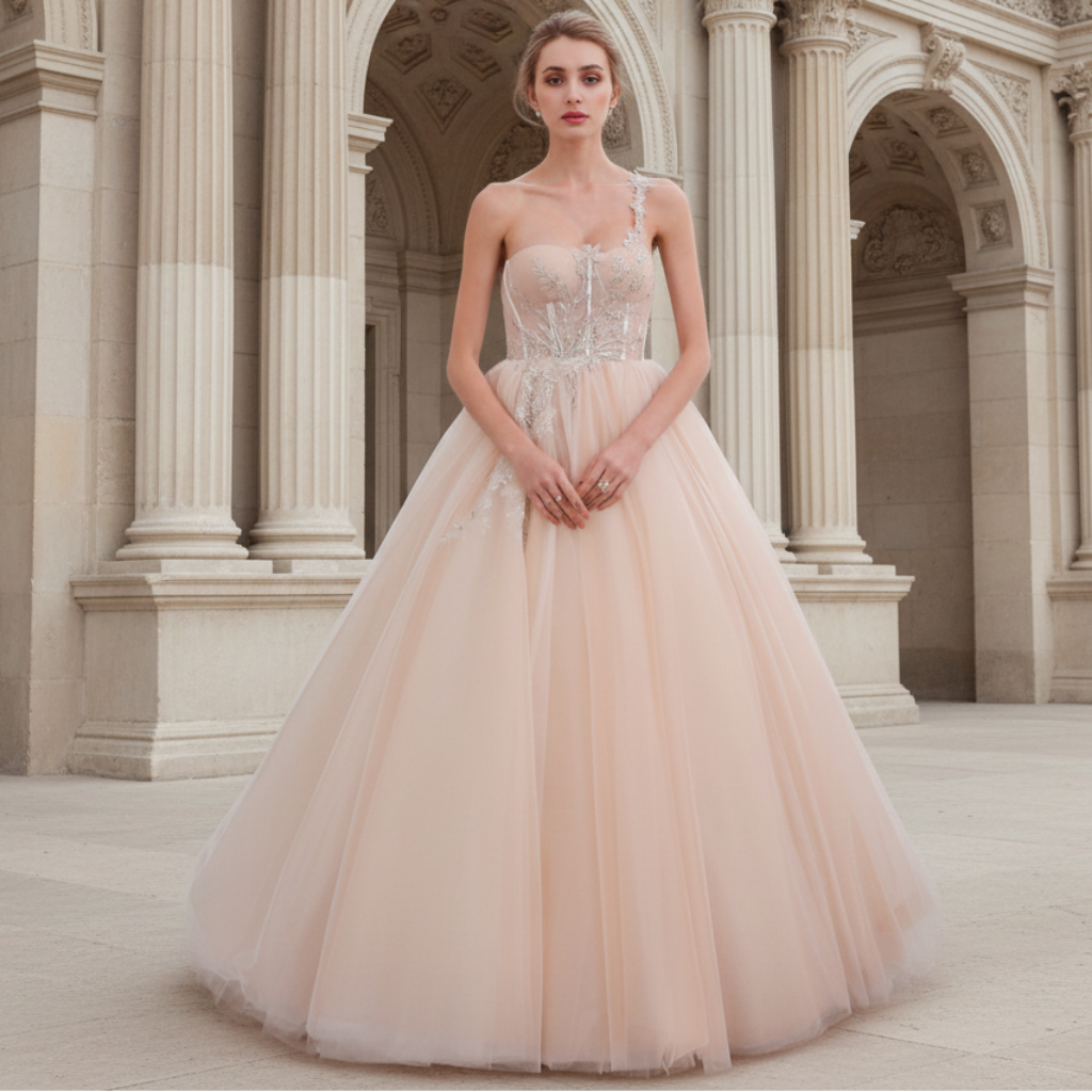 Este precioso vestido de novia presenta una sola tira y una falda abullonada, creando una impresionante silueta de vestido de fiesta. El color ruborizado y los intrincados apliques de encaje añaden un toque de elegancia y romance a esta hermosa pieza. Perfecto para cualquier novia que busque un look atemporal e inolvidable.