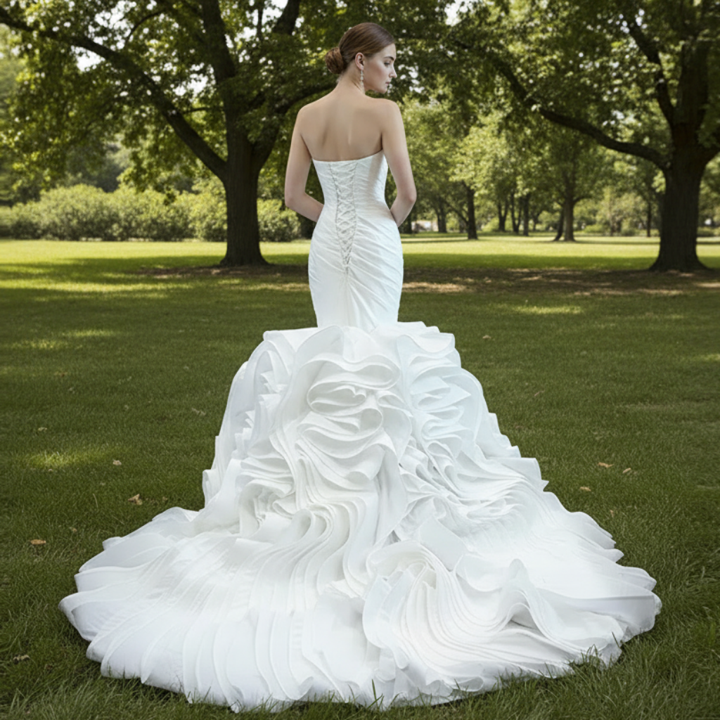 Adopta la sofisticación atemporal con este exquisito vestido de novia hecho a mano, donde el diseño arquitectónico se fusiona con la elegancia romántica. El vestido presenta un impresionante escote en V sin tirantes, meticulosamente fruncido para crear un corpiño favorecedor y esculpido que realza con elegancia tus curvas naturales. La dramática silueta de trompeta se funde con una impresionante falda con volantes, confeccionada con capas de lujosa organza y satén que caen en cascada en suaves y románticas ondas a cada paso.
