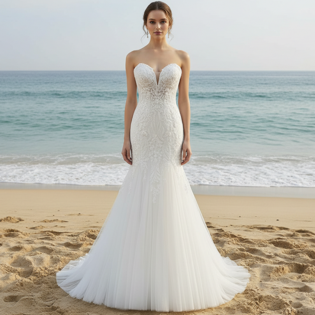 Este impresionante vestido de novia de corte sirena con apliques de encaje presenta un favorecedor escote en forma de corazón que acentúa la clavícula. El corpiño y la espalda transparentes aportan un toque encantador y permiten un movimiento cómodo. Perfecto para la novia moderna que quiere causar sensación en su día especial.