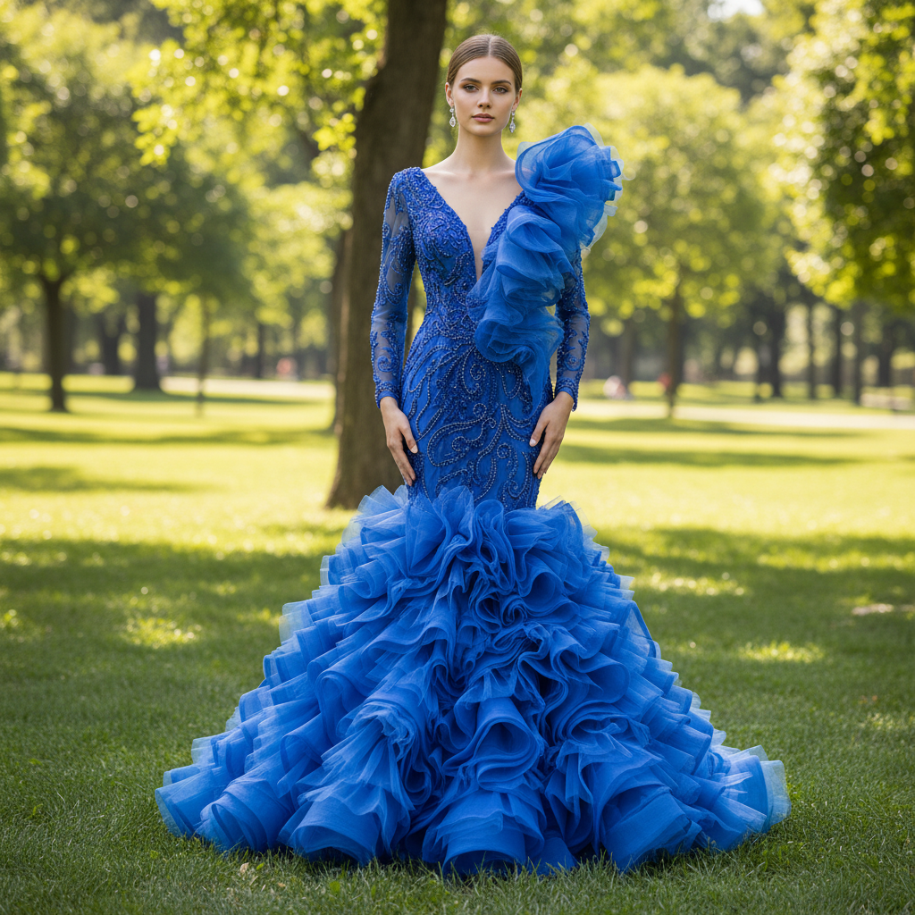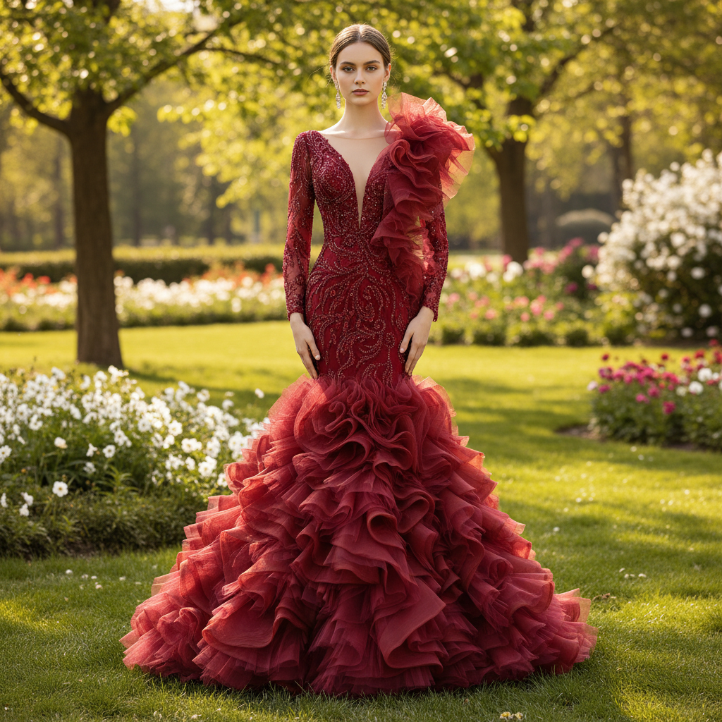 ¡Sé el centro de atención con nuestro impresionante vestido de fiesta de sirena! Con mangas largas y detalles de volantes, este vestido de fiesta de noche te hará sentir como una verdadera princesa sirena. Sé la reina del baile y llama la atención con este diseño cautivador y elegante.