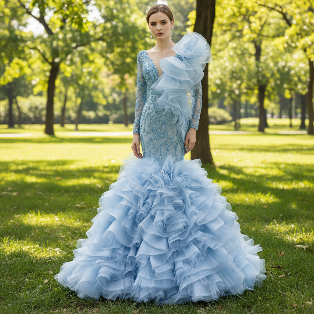 Vestido de desfile de sirena Vestidos de fiesta de noche con volantes de manga larga