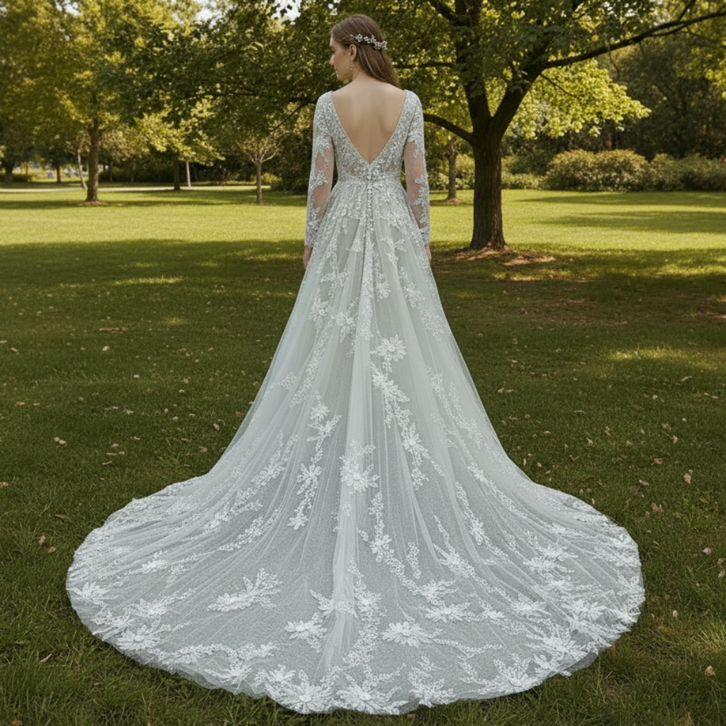 Acapara todas las miradas el día de tu boda con este impresionante vestido de novia de encaje de manga larga y espalda descubierta, diseñado por expertos para encarnar la belleza atemporal y la elegancia moderna. El elegante escote en V enmarca a la perfección tu rostro y escote, mientras que la tela transparente crea un efecto suave y onírico, enriquecido por exquisitos adornos florales en 3D, que añaden profundidad y un toque romántico al look. Cada detalle del intrincado encaje está cuidadosamente colocado para realzar tu figura y realzar tus curvas naturales, garantizando un ajuste que se siente tan magnífico como se ve. La espalda descubierta revela la cantidad justa de piel, ofreciendo un sofisticado toque de sensualidad sin comprometer la elegancia, perfecto para novias que buscan sentirse seguras y cautivadoras. Confeccionado con materiales ligeros, este vestido permite un movimiento sin esfuerzo, para que puedas bailar, reír y celebrar cómodamente día y noche. Ya sea que caminen hacia el altar, intercambien votos o compartan su primer beso como pareja casada, este vestido realza cada momento, prometiendo crear recuerdos imborrables y un look nupcial que sus invitados recordarán por años. Elige este vestido para expresar tu estilo único con gracia, belleza y elegancia en el día más importante de tu vida.