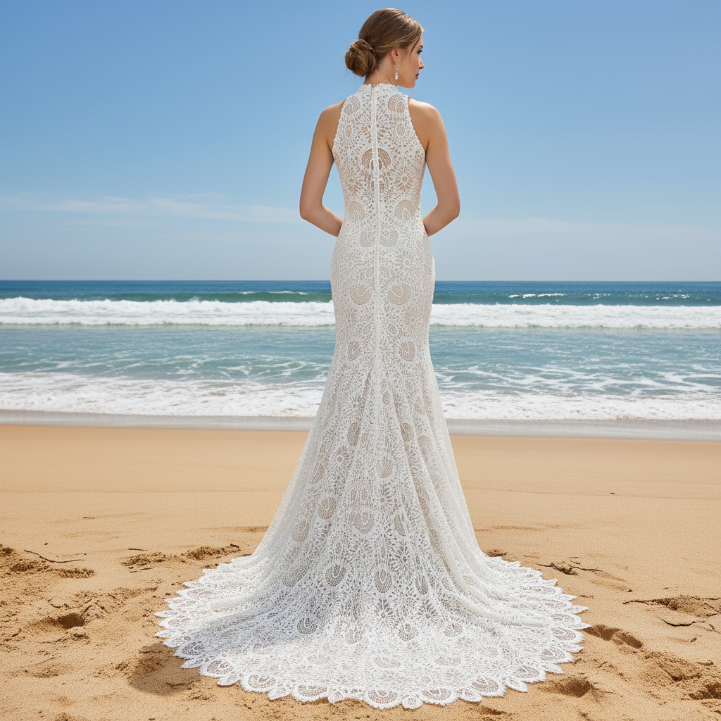 Entra en el día de tu boda irradiando gracia y sofisticación con este elegante vestido de novia de corte sirena y cuello alto de encaje. Diseñado para crear un look nupcial inolvidable, el intrincado encaje floral envuelve el vestido en una delicada belleza, reflejando la luz con un sutil brillo que realza su encanto atemporal. El majestuoso cuello alto atrae todas las miradas con una silueta refinada, mientras que el discreto escote redondo inferior añade un delicado contraste, fusionando con naturalidad la modestia y la elegancia contemporánea. Confeccionado por expertos en corte sirena, este vestido esculpe y favorece tu figura, enfatizando tus curvas naturales con una línea elegante y grácil que fluye con gracia al moverte. Elaborado con tejidos transpirables de primera calidad, el vestido garantiza una comodidad suprema sin sacrificar ni un ápice de estilo, para que te sientas radiante y segura desde que camines hacia el altar hasta el último baile de la noche. Cada detalle ha sido cuidadosamente considerado, haciendo de este vestido de novia la opción perfecta para novias que buscan una combinación impecable de belleza clásica y sofisticación moderna. Con su exquisita confección y su cautivador diseño, este vestido promete dejar una impresión imborrable, haciendo que su día especial sea verdaderamente excepcional.