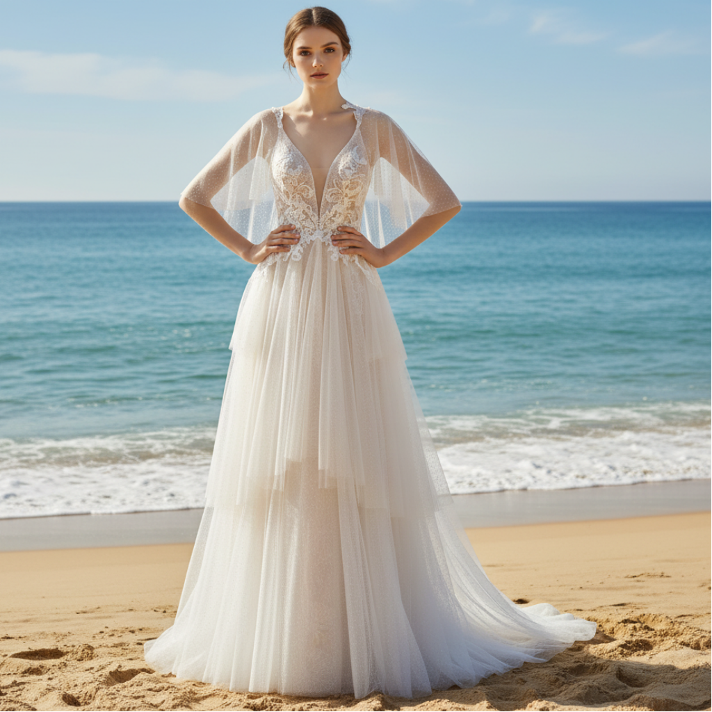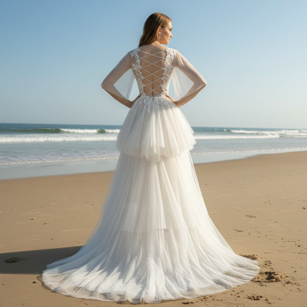 Este elegante vestido de novia presenta un impresionante diseño de espalda abierta, que añade un toque de sofisticación y encanto a tu día especial. El tul de varias capas y los delicados detalles de encaje crean una silueta de inspiración bohemia, perfecta para la novia moderna. Luce y siéntete hermosa sin esfuerzo con este vestido atemporal y elegante.
