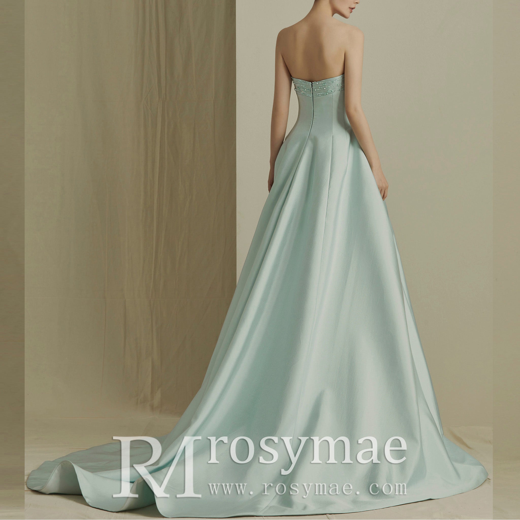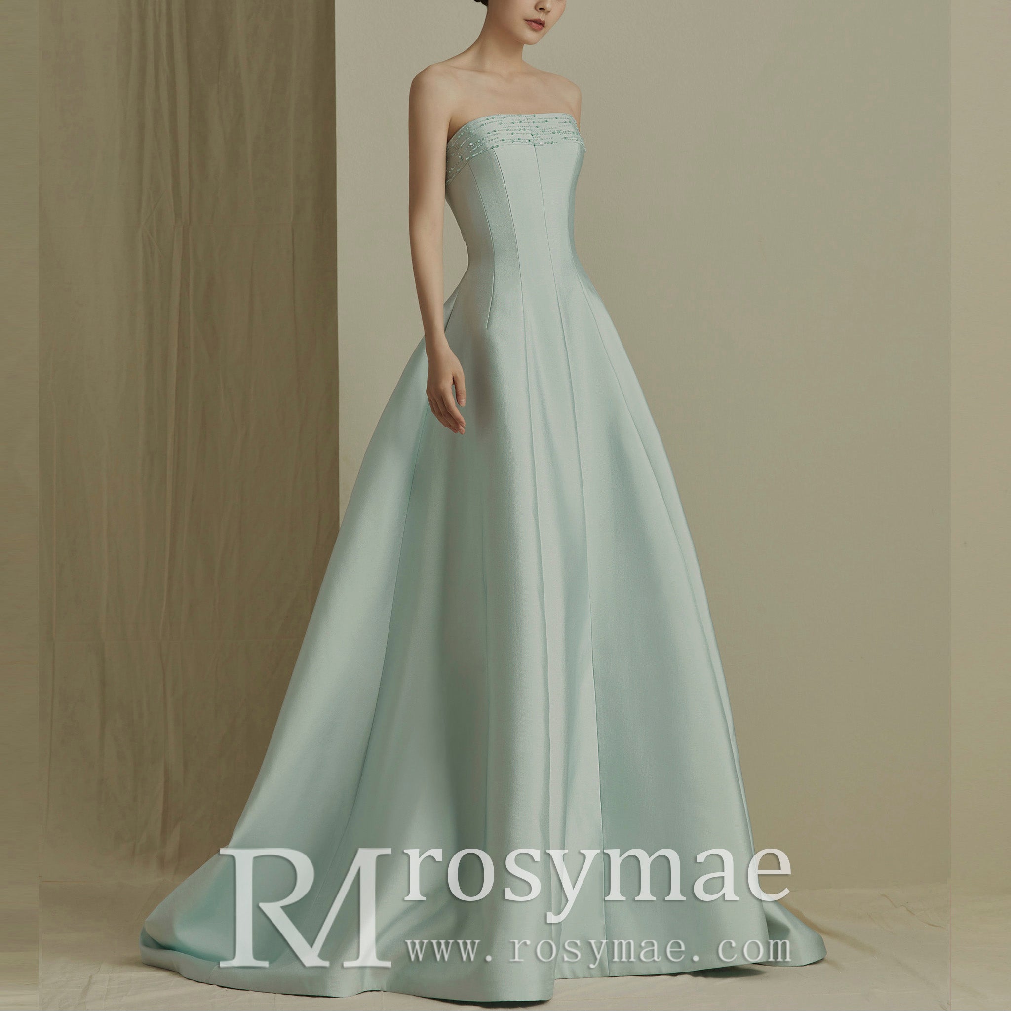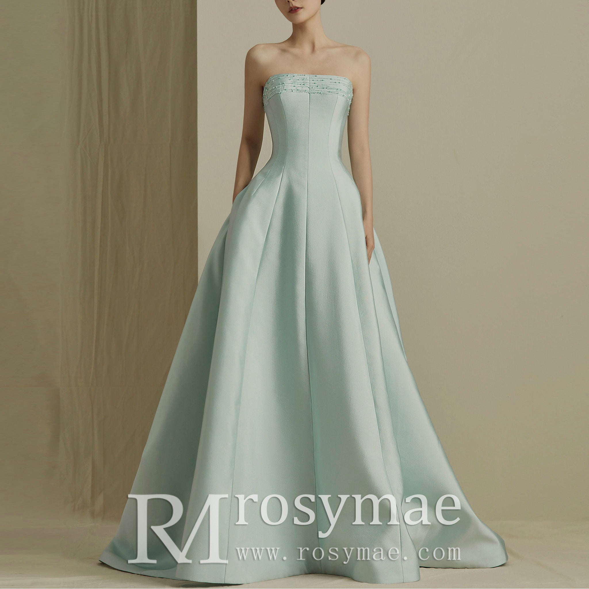 Este vestido de novia de corte A de satén verde claro presenta un diseño sin tirantes y escote recto. El bolsillo añade comodidad para que la novia tenga lo esencial a mano en su día especial. Disfruta de la comodidad y elegancia de este impresionante vestido.