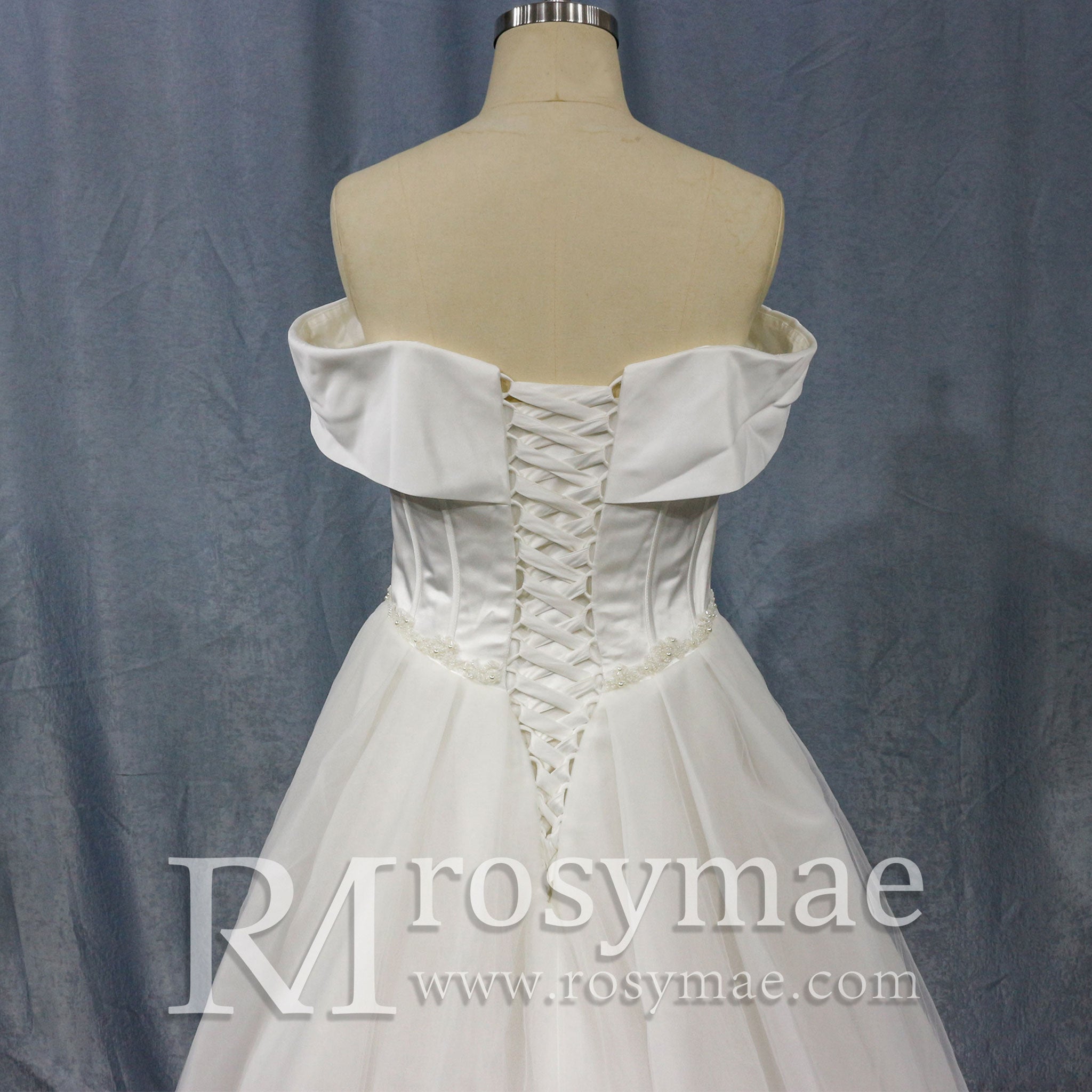 Este vestido de novia presenta un diseño romántico con hombros descubiertos, un lujoso top de satén y una falda de tul fluida. El estilo vintage añade un toque de nostalgia a tu día especial. Encarna elegancia y gracia con este vestido de corte A.