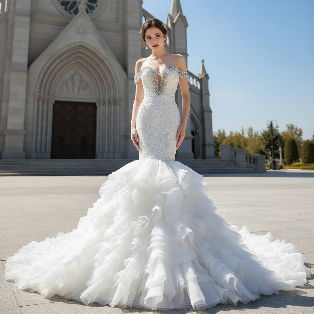 Diseñado para la novia exigente, este singular vestido de novia de corte trompeta es la personificación del lujo y la elegancia. Cada curva de la silueta está adornada con un exquisito arreglo de brillantes perlas y brillantes pedrería, creando un efecto deslumbrante, digno de alta costura. El dramatismo del vestido se despliega en su falda con capas y volantes, que le aporta movimiento y un toque romántico y moderno. Un elegante escote con hombros descubiertos enmarca la clavícula con belleza, aportando un aire de sofisticación atemporal. Meticulosamente hecho a mano con pasión y precisión, este vestido es más que un vestido: es una obra de arte para llevar, diseñada para hacerte sentir magnífica mientras celebras tu día más especial.