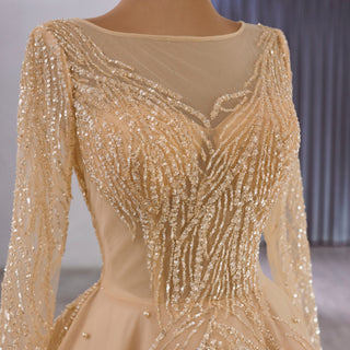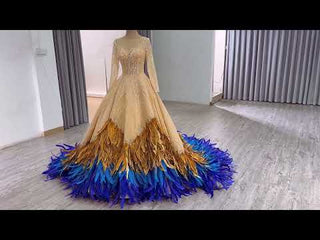 Realza tu estilo con este exquisito vestido formal de manga larga, diseñado para encarnar el lujo y la sofisticación en cada ocasión. El elegante color champán combina a la perfección con un corpiño transparente y mangas largas con intrincadas lentejuelas, destacando la maestría artesanal y la meticulosa atención al detalle. La impresionante combinación de plumas de avestruz azules y doradas añade un toque dramático y refinado, infundiendo al vestido opulencia y un glamour único que te garantiza ser el centro de atención en cualquier ocasión especial. La silueta ajustada del vestido realza tu figura con gracia, mientras que los delicados detalles de plumas crean un movimiento y una textura cautivadores, realzando tu presencia al entrar en el salón. Perfecto para galas, cócteles, bodas o eventos formales de alto perfil, este vestido combina una elegancia atemporal con atrevidos adornos para ofrecer un look inolvidable. Diseñado para brindar comodidad y estilo, te permite moverte con confianza y naturalidad durante todo el evento. Convierte este lujoso vestido adornado con plumas en la pieza destacada de tu guardarropa y adopta la armonía perfecta entre belleza refinada y sofisticación audaz para momentos que atesorarás por siempre.
