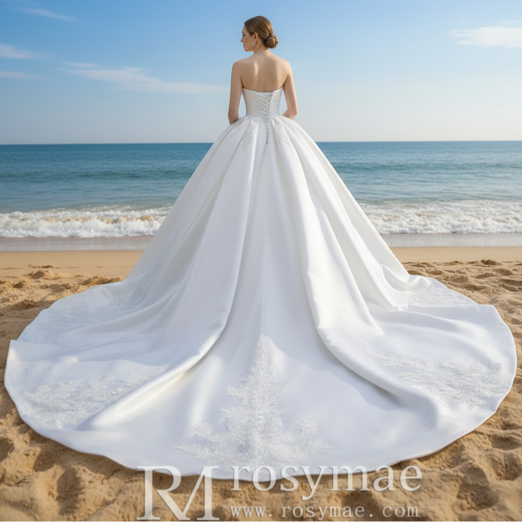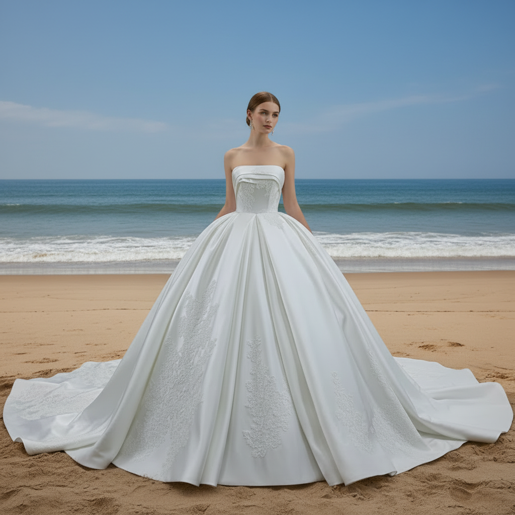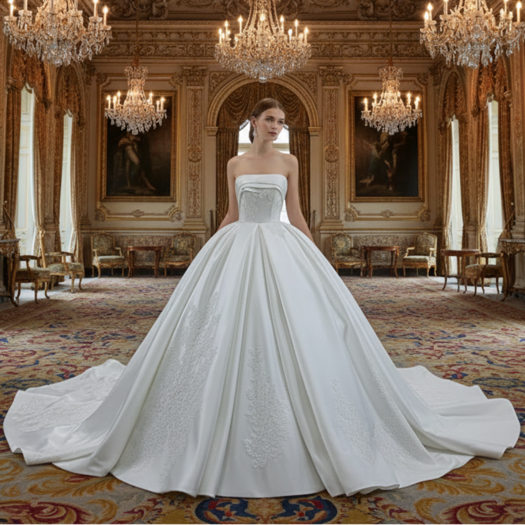 Este vestido de novia de satén sin tirantes, elaborado por expertos, combina la gracia moderna con la elegancia nupcial atemporal. El refinado escote recto complementa a la perfección la voluminosa silueta del vestido de gala, con una espectacular falda abullonada y una elegante cola. Las intrincadas aplicaciones de encaje, meticulosamente aplicadas a mano, añaden un toque artesanal de romanticismo. El diseño de espalda baja aporta un sutil encanto contemporáneo, mientras que el lujoso tejido de satén garantiza un acabado radiante y elegante. Perfecto para la novia que busca una declaración de sofisticación clásica, este vestido realzará su día especial con su armoniosa combinación de artesanía y belleza.