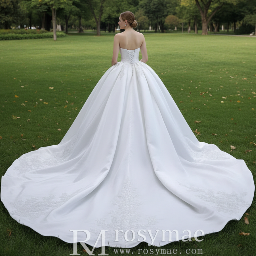 Vestido de novia de satén sin tirantes con cuello recto y falda abullonada