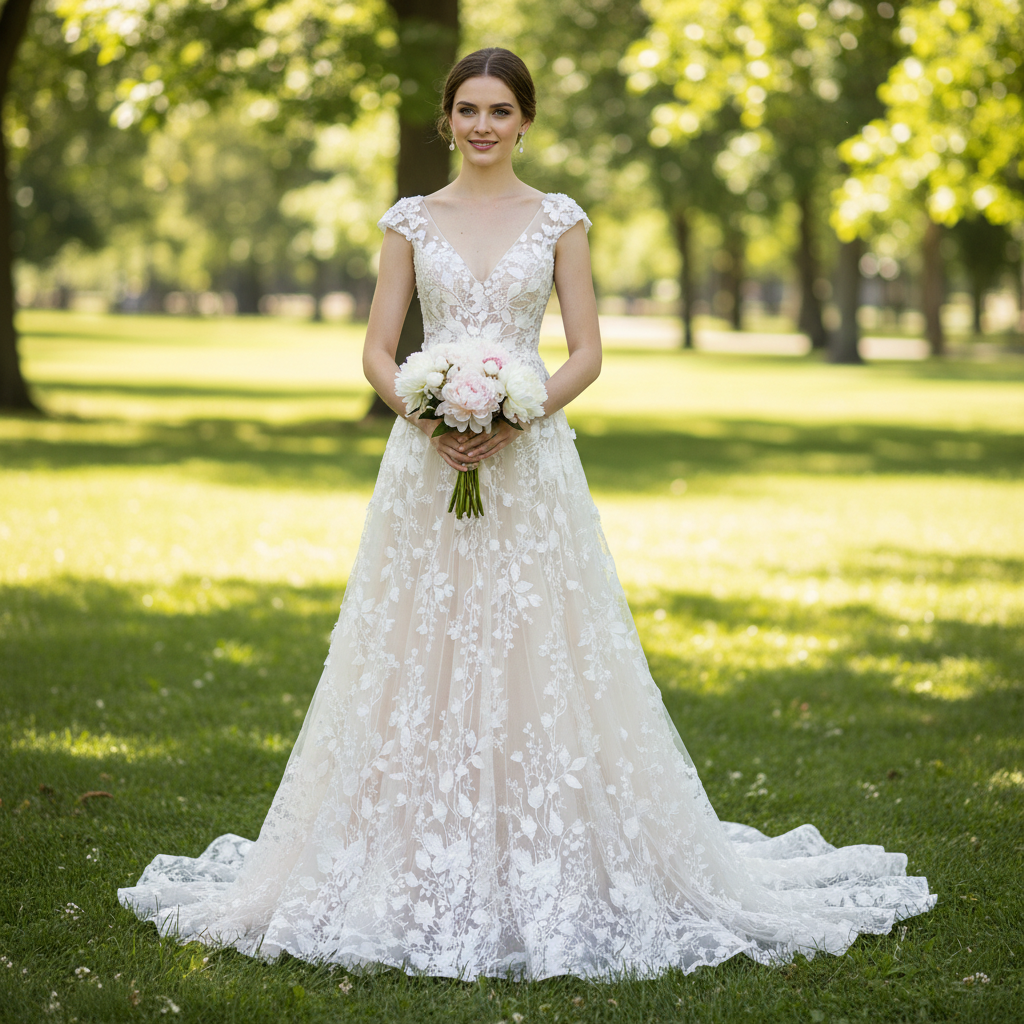 Este exquisito vestido de novia de encaje floral, con espalda abierta y corte A, está meticulosamente elaborado para que cada momento de tu día especial sea inolvidable. Su delicado encaje floral superpuesto le otorga un encanto romántico y atemporal, combinando a la perfección la elegancia vintage con la gracia moderna. Su favorecedora silueta en corte A realza tu figura natural, con una caída hermosa que te ofrece comodidad y libertad de movimiento durante la celebración. Hecho de tela transparente y ligera, revela sutilmente tu piel, aportando una dimensión seductora y elegante que realza tu belleza natural sin opacarla. Las encantadoras mangas cortas aportan un toque suave y femenino que equilibra a la perfección la dramática espalda abierta, creando una armoniosa mezcla de suavidad y sofisticación. Cada detalle, desde los patrones de encaje floral hasta la delicada caída de la falda, ha sido cuidadosamente diseñado para hacerte sentir extraordinaria. Ya sea que camines con gracia hacia el altar, compartas momentos tiernos durante tus votos o bailes hasta altas horas de la noche, este vestido te garantiza cautivar y encantar a todos a tu alrededor. Perfecto para novias que buscan un vestido que combine la belleza clásica con un estilo contemporáneo, inspira confianza, resplandor y una elegancia atemporal que recordarás por siempre. Celebra tu boda inolvidable con un vestido que refleje la esencia misma del amor y la celebración.
