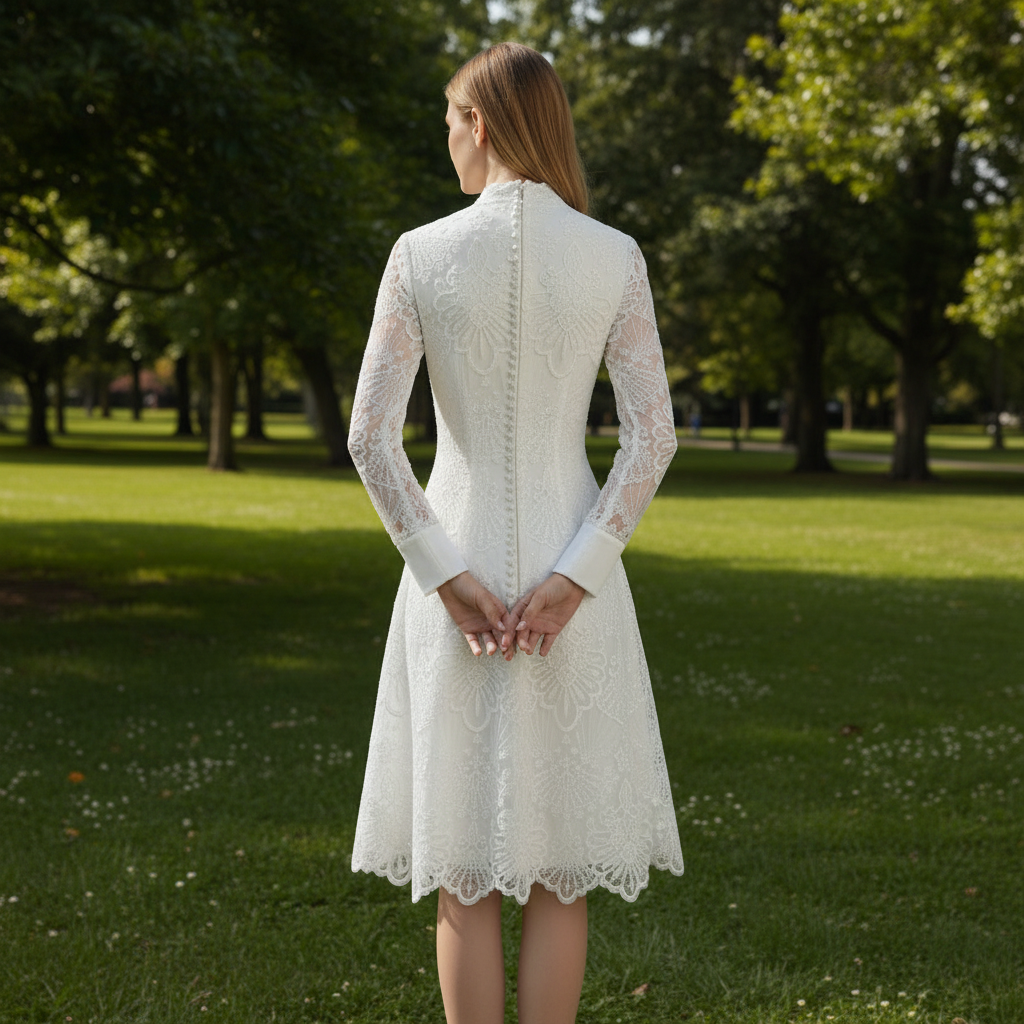 Haz que el día de tu boda sea inolvidable con este elegante vestido de novia de encaje de corte A y manga larga hasta la rodilla, diseñado cuidadosamente para celebrar tu belleza y gracia. Cada elemento exhibe una artesanía excepcional, desde los delicados botones forrados en tela que se deslizan con gracia por la parte delantera y trasera, hasta el refinado escote alto que irradia una sofisticación majestuosa. La silueta de corte A en forma de mariposa favorece cada figura al combinar un soporte estructurado con un movimiento suave y fluido, garantizando comodidad y estilo desde la ceremonia hasta la celebración. Intrincados patrones de encaje adornan todo el vestido, infundiéndole una textura romántica y un encanto atemporal, mientras que la falda a media pierna ofrece una elegancia de inspiración vintage que te permite bailar y socializar con facilidad. Las mangas largas añaden una cobertura discreta pero elegante, equilibrando a la perfección la tradición clásica con la moda contemporánea. Ideal para novias que buscan una combinación armoniosa de refinamiento y comodidad, este vestido promete hacerte sentir radiante, segura y cautivadora durante tu especial camino al altar.