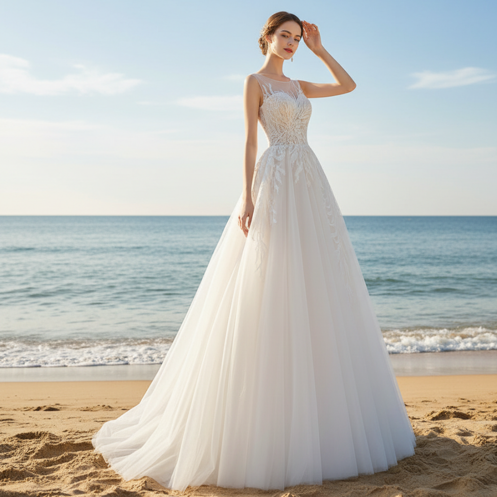 Encantador vestido de novia corte A en tul champán y encaje, con escote transparente y espalda descubierta. Su corte princesa combina detalles románticos con elegancia contemporánea, creando una estética nupcial refinada que realza la figura a la vez que conserva un encanto atemporal. Perfecto para la novia moderna que busca un vestido sofisticado y versátil, ideal para bodas y celebraciones diversas.